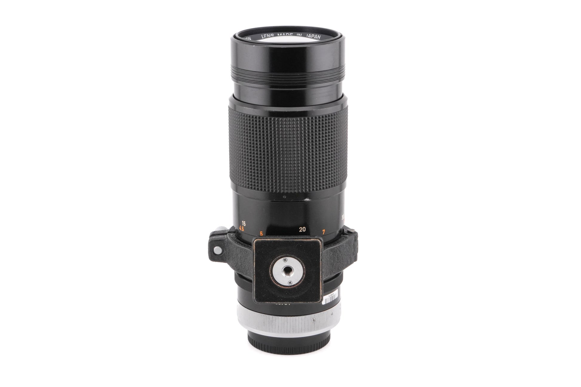 Manual focus telephoto lens made for FD mount SLRs by Canon in 1973. The lens is single-coated and has a built-in lens hood. The original price (47,100 Yen) is equal to ~950 Euros in 2023. Metal body available in black.