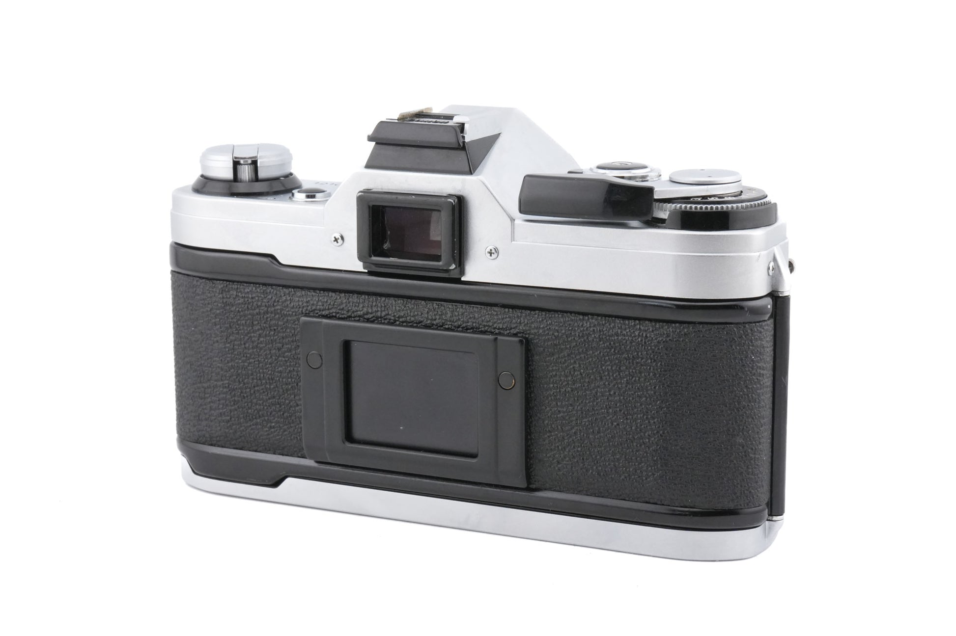 Manual focus FD-mount 35mm SLR camera released by Canon in 1976. It was the first SLR to feature a microprocessor for calculating exposure data. It features shutter priority autoexposure and fully manual exposure. Metal and plastic body available in silver and black.