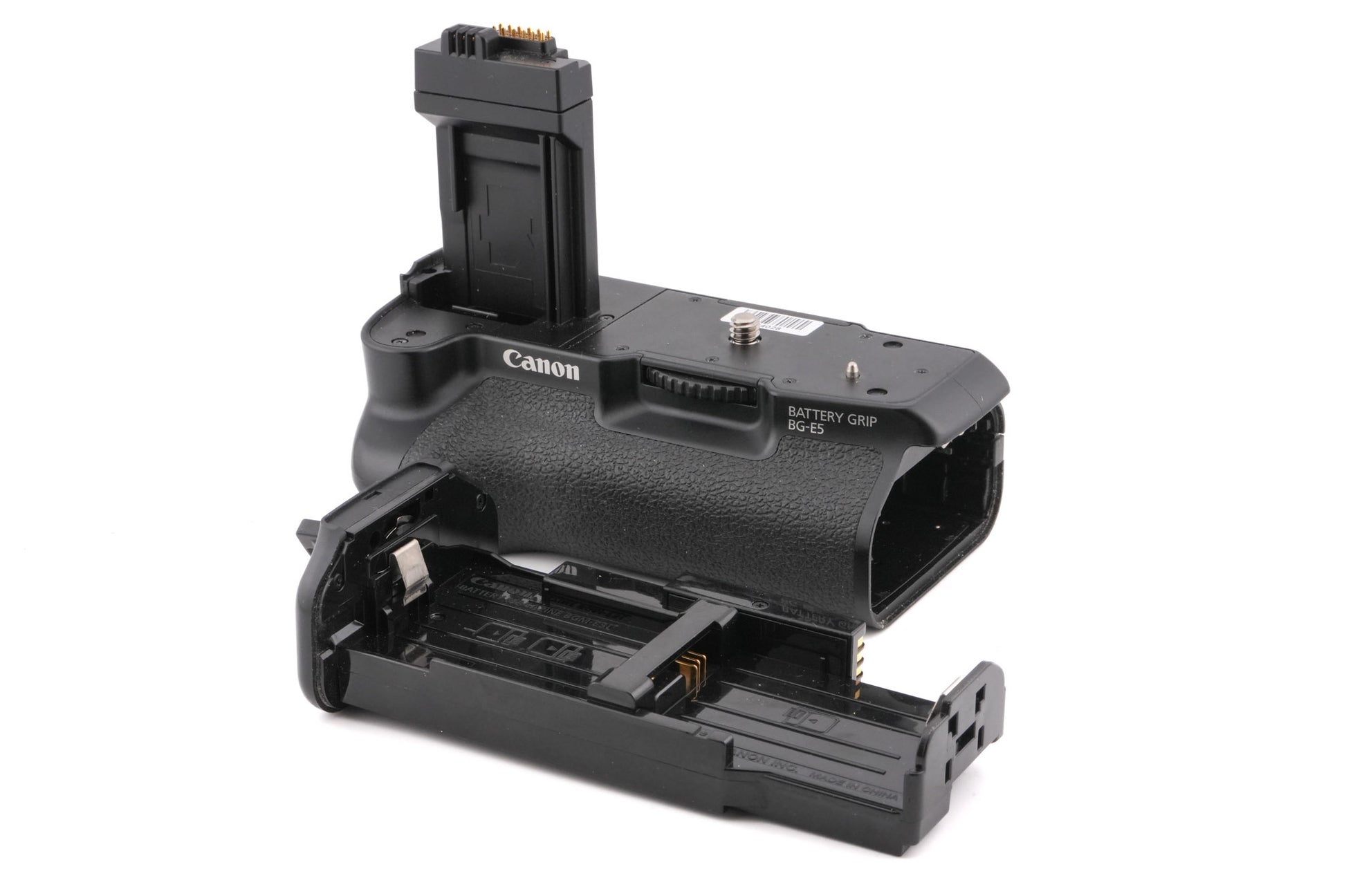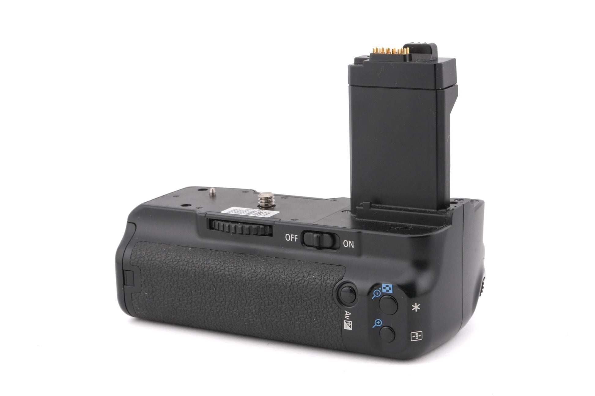 Battery grip for Canon 450D, 500D and 1000D cameras made by Canon. Powered by LP-E5 batteries when used with the BGM-E5L holder or AA batteries with the BGM-E5A holder. Black plastic construction.