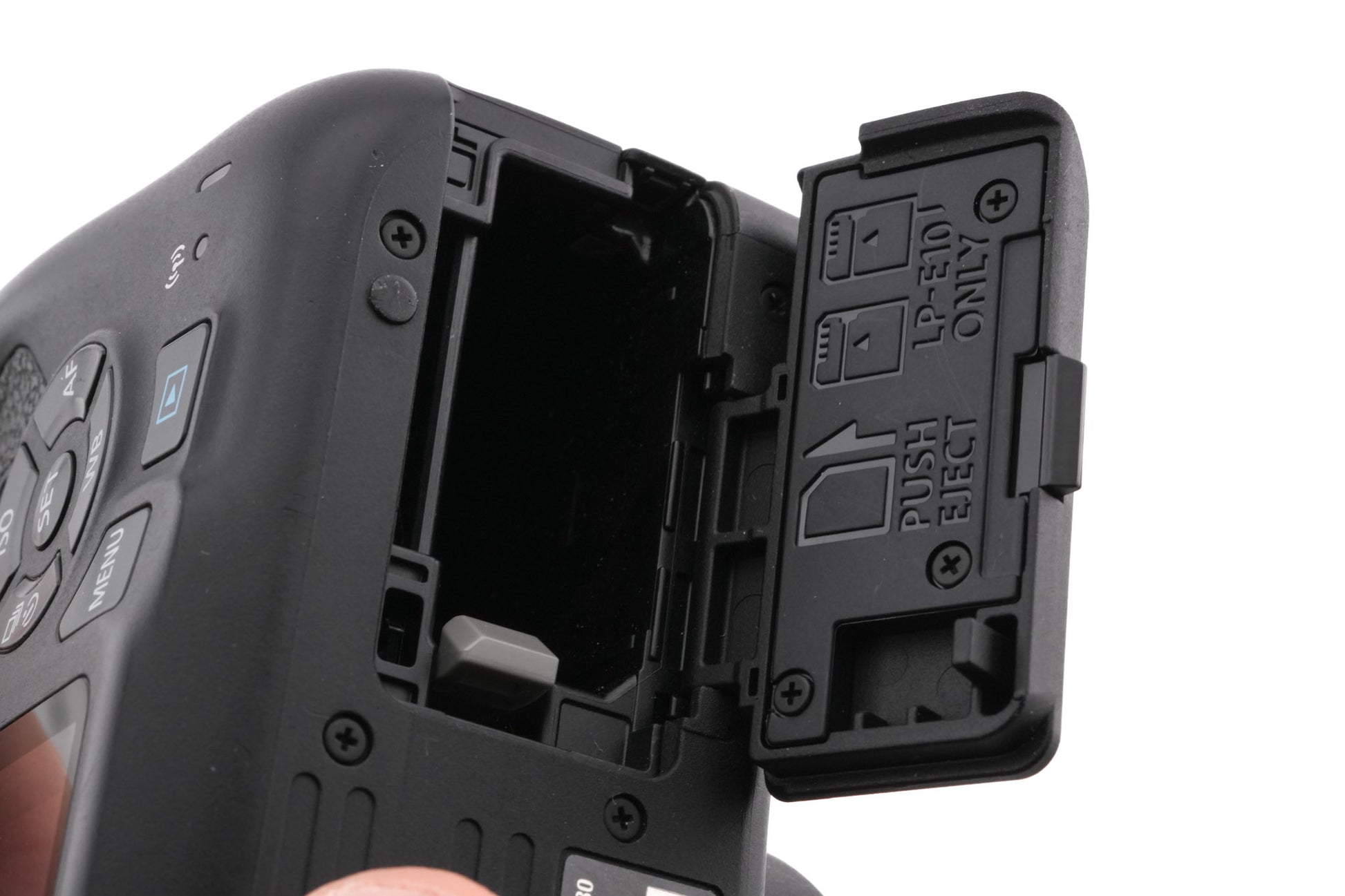 Autofocus APS-C Canon EF mount DSLR camera released by Canon in 2016. Has 1080p Full HD video recording and a 3” LCD screen. Plastic body available in black.