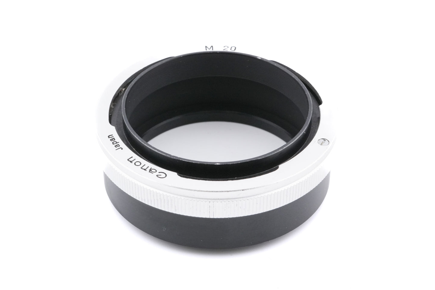 20mm extension tube made for FD-mount 35mm SLR camera and lenses introduced by Canon. This extension tube has no coupling to stop down the lens and uses the older breech-lock style mounting mechanism. Metal body available in black/silver.