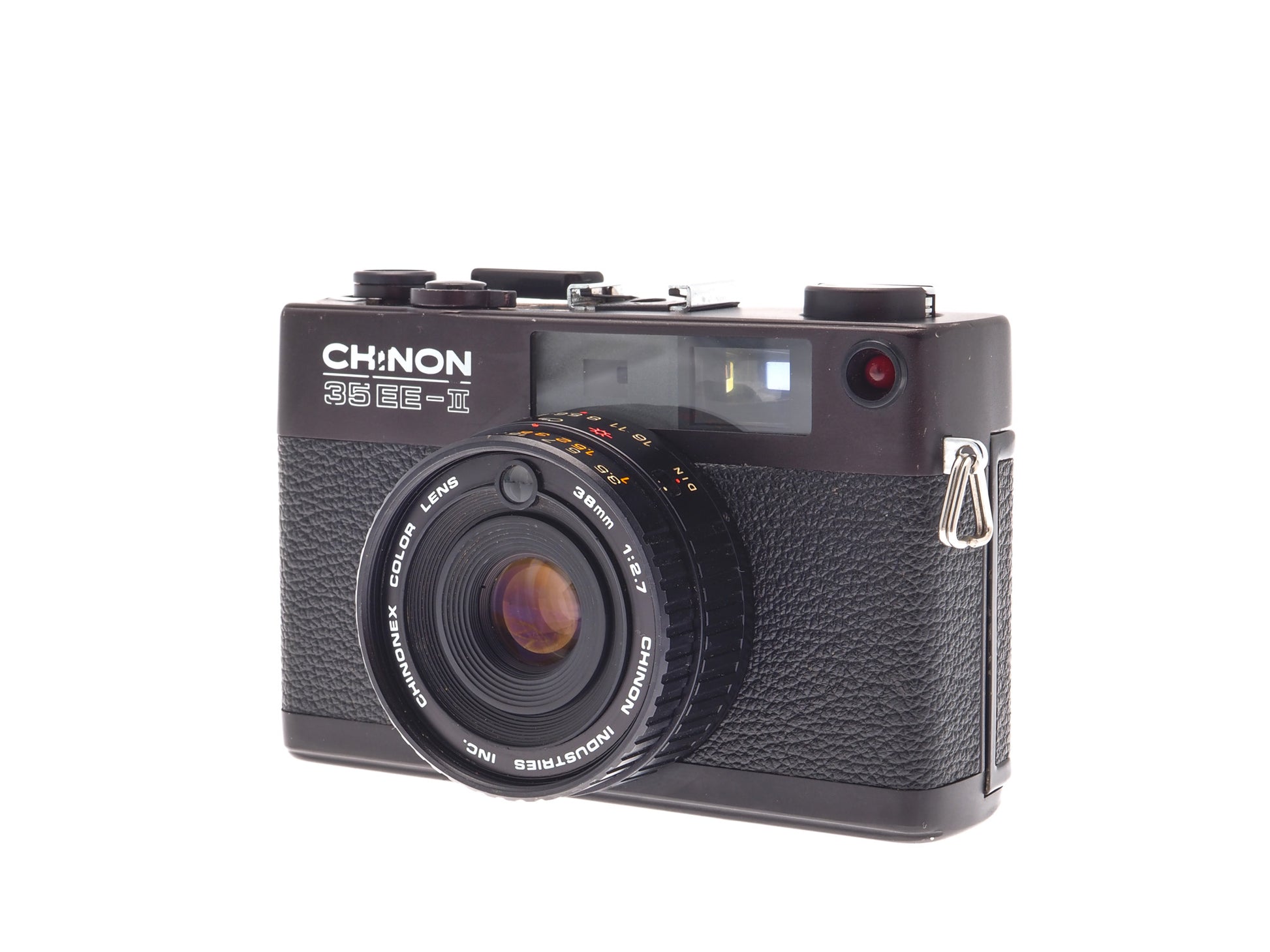 35mm manual focus compact camera released by Chinon in the 1980s. Has aperture priority exposure. Has a hot shoe, a self-timer, and a shutter button lock. Uses 2 1.3v PX640 mercury batteries. Metal body available in black.