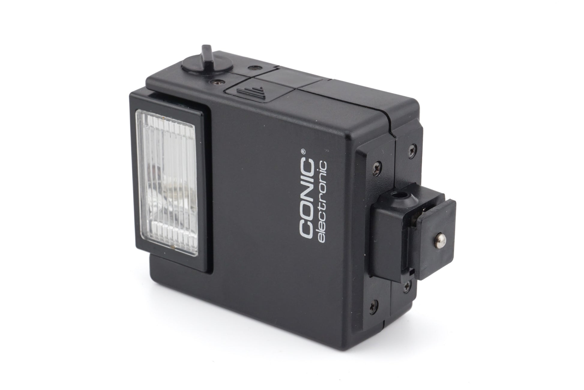 Simple single pin flash made by Conic. Flash head tilts upwards making bounce flash possible. Plastic construction in black finish.