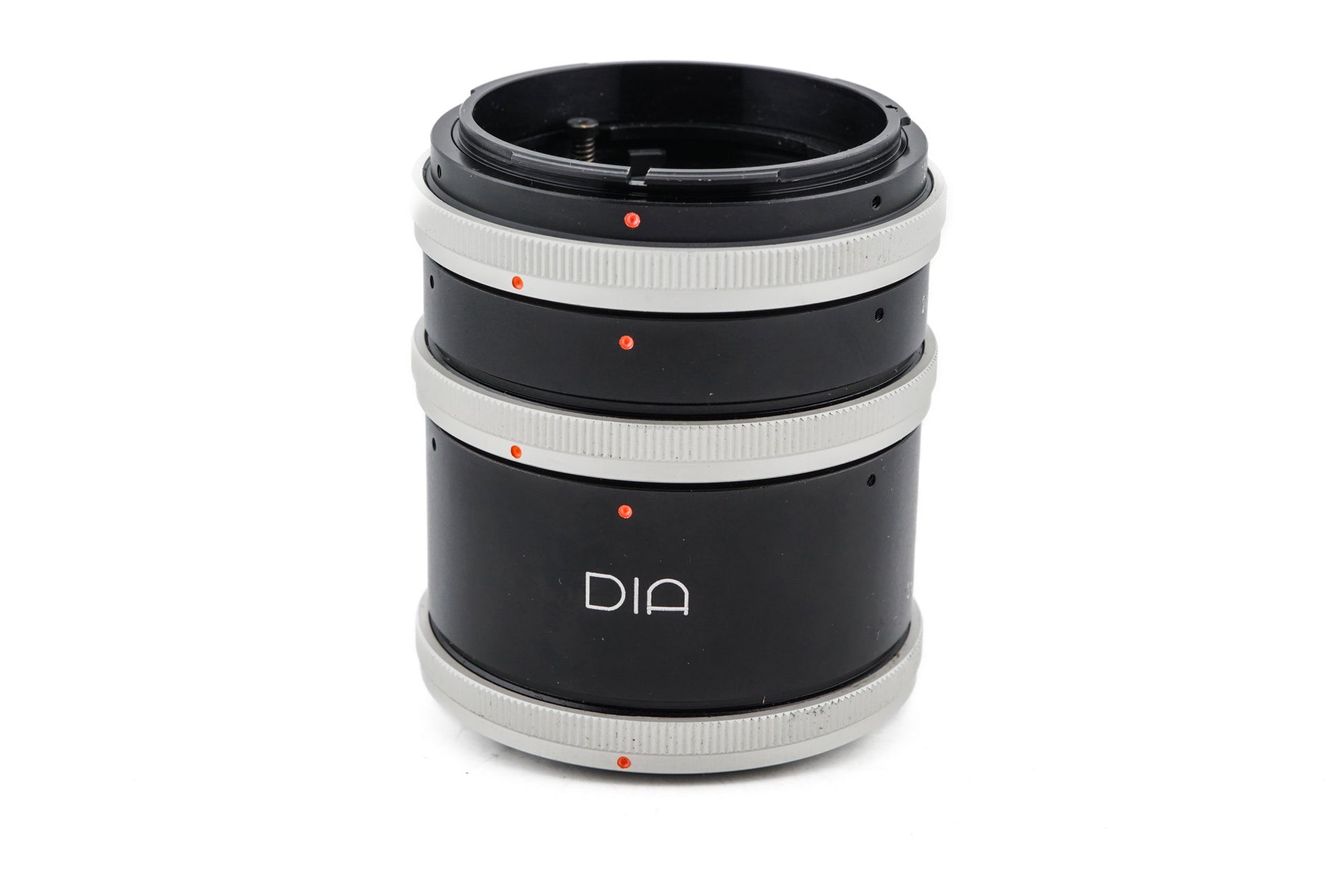 Extension tube set made for FD-mount lenses and cameras introduced by DIA. It consists of a 12mm, 20mm, and 36mm tube. Metal body available in black.