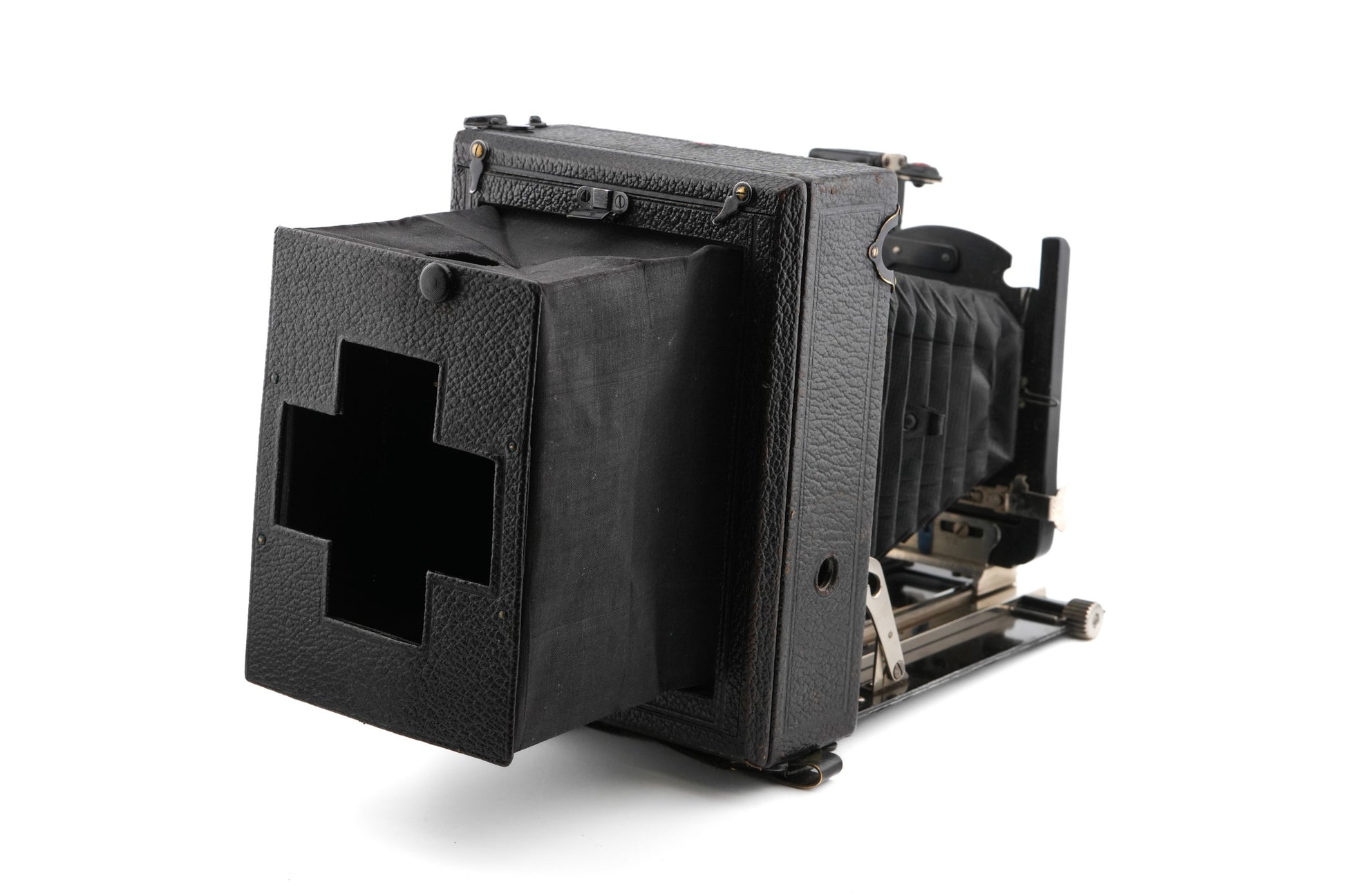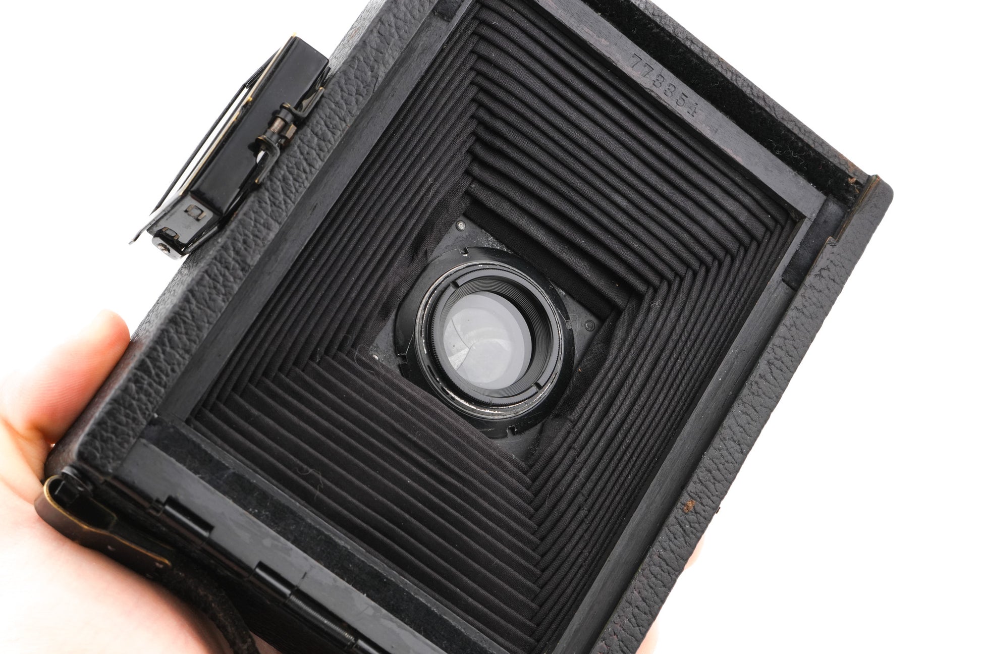 Manual focus 6x9" large format folding camera made by Heinrich Ernemann in 1913. Released with a Ernemann Ernoplast 120mm f4.5 lens. Metal construction available in black.