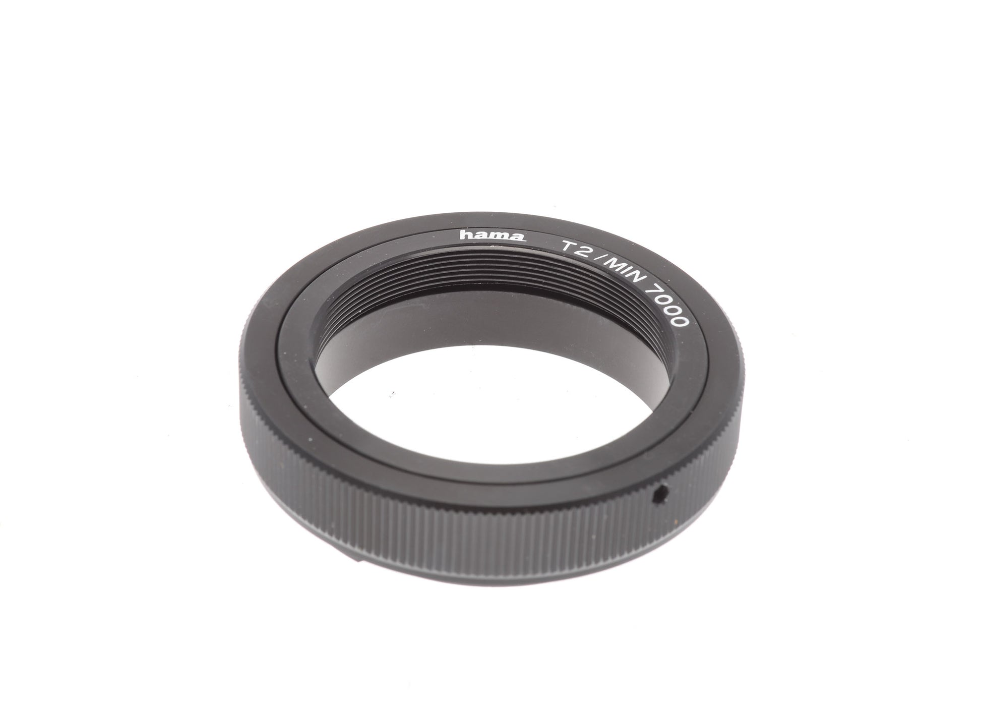 Lens adapter made by Hama for Minolta AF mount bodies. Adapts T2 lenses to Minolta bodies. Black metal body.