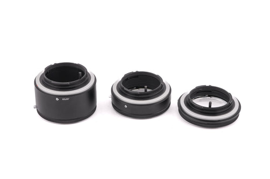 Set of three extension tubes made for MD-motun 35mm SLR cameras introduced by Kennex. It consists of a 36mm, 20mm, and 12mm tube. Metal body available in black.