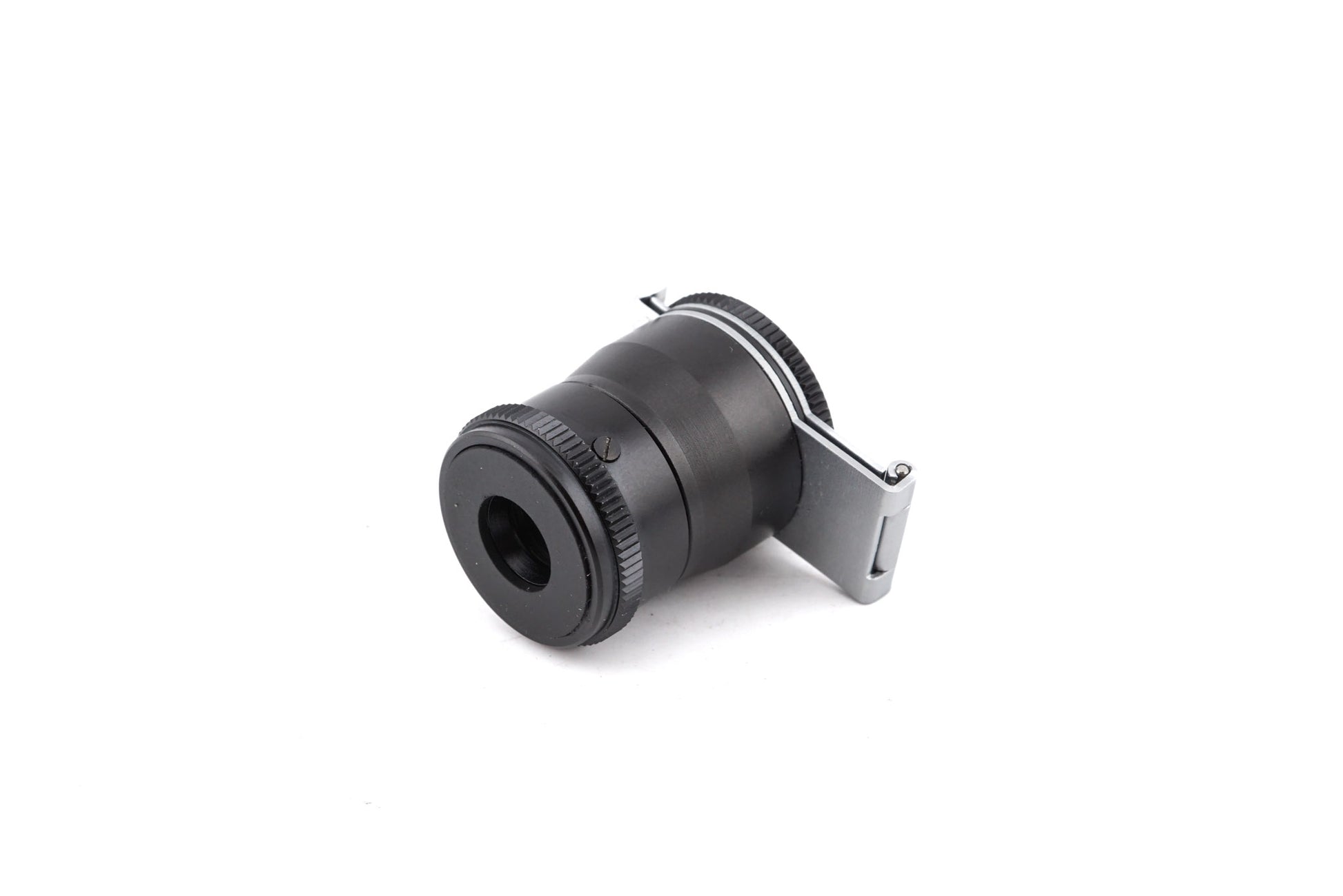 Magnifier made by Konica. Has a magnification ratio of 2x and a built-in diopter correction from +3 to -7. Designed for the screw-in thread of the round camera eyepieces of the older Konica cameras up to the Autoreflex T3N. Metal body available in black.