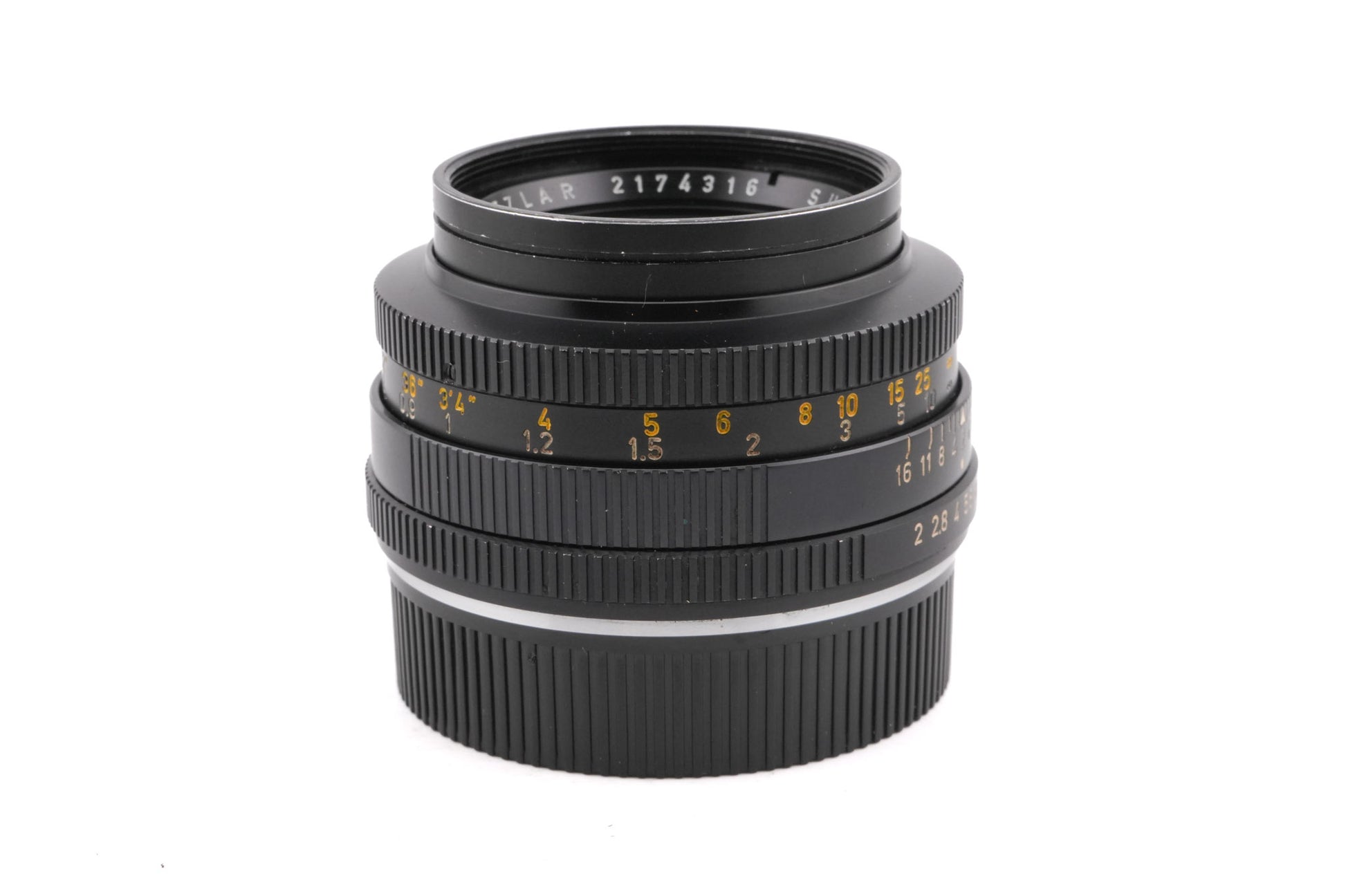Manual focus normal lens made for R-mount 35mm SLR cameras introduced by Leica in 1964. It was initially released in silver, but this was quickly changed to black. Only 200-300 silver lenses were ever manufactured. This lens has a 1-Cam mount. 1-Cam lenses have a single sloped cam and are compatible with the SL/SL2 and R-series cameras in stop-down metering mode only. They are not recommended to be used on the R8/R9. Metal body available in black (11218).