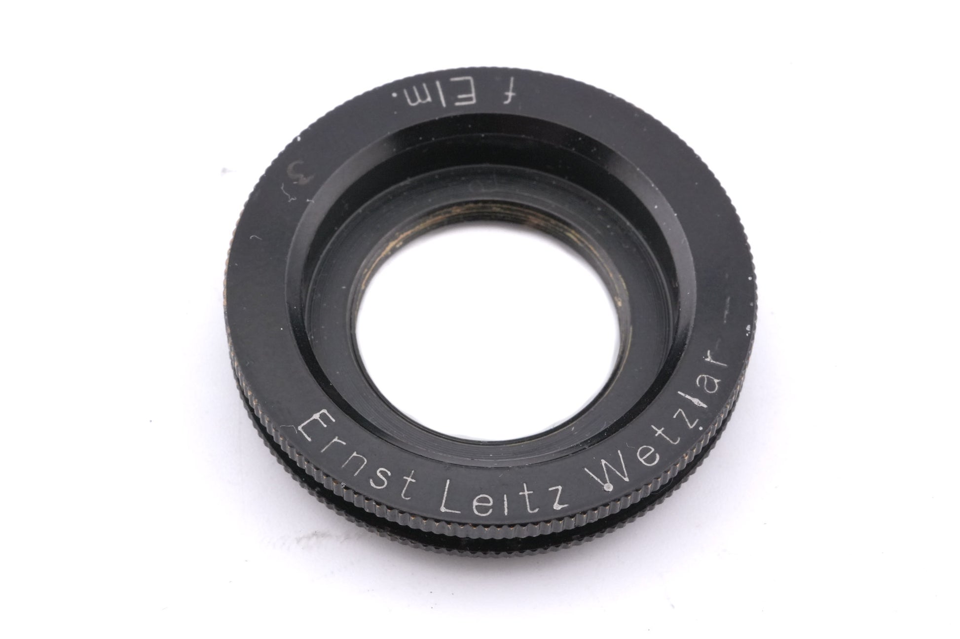Adapter ring for mounting close-up lenses meant for 5cm f3.5 Elmar (ELPRO, ELPIK, and ELPET) to the 5cm f2 Summar. Marked "f. Elm" to signify the compatibility with the Elmar close-up lenses. Two variations exists, black "Wetzlar" marked one and a silver "New York" marked one. Not to be confused with VORGI, as that adapter is to be used with the same lens in similar fashion but with the close-up lenses that were originally meant for the 5cm f2.5 Hektor. Metal body available in black or silver.