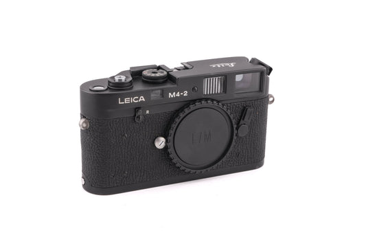 Manual focus M-mount 35mm rangefinder camera released by Leica in 1978. The M4-2 is manufactured entirely by Leitz Canada. It is similar to the M4 but lacks the self-timer, has a hot shoe, and is designed to accept a motor winder. It has a finder magnification of 0.72x and frame lines for 35mm, 50mm, 90mm, and 135mm lenses. The M4-2 experienced many variations in the type and placement of engravings over the production period. Metal body available in black (10410).
