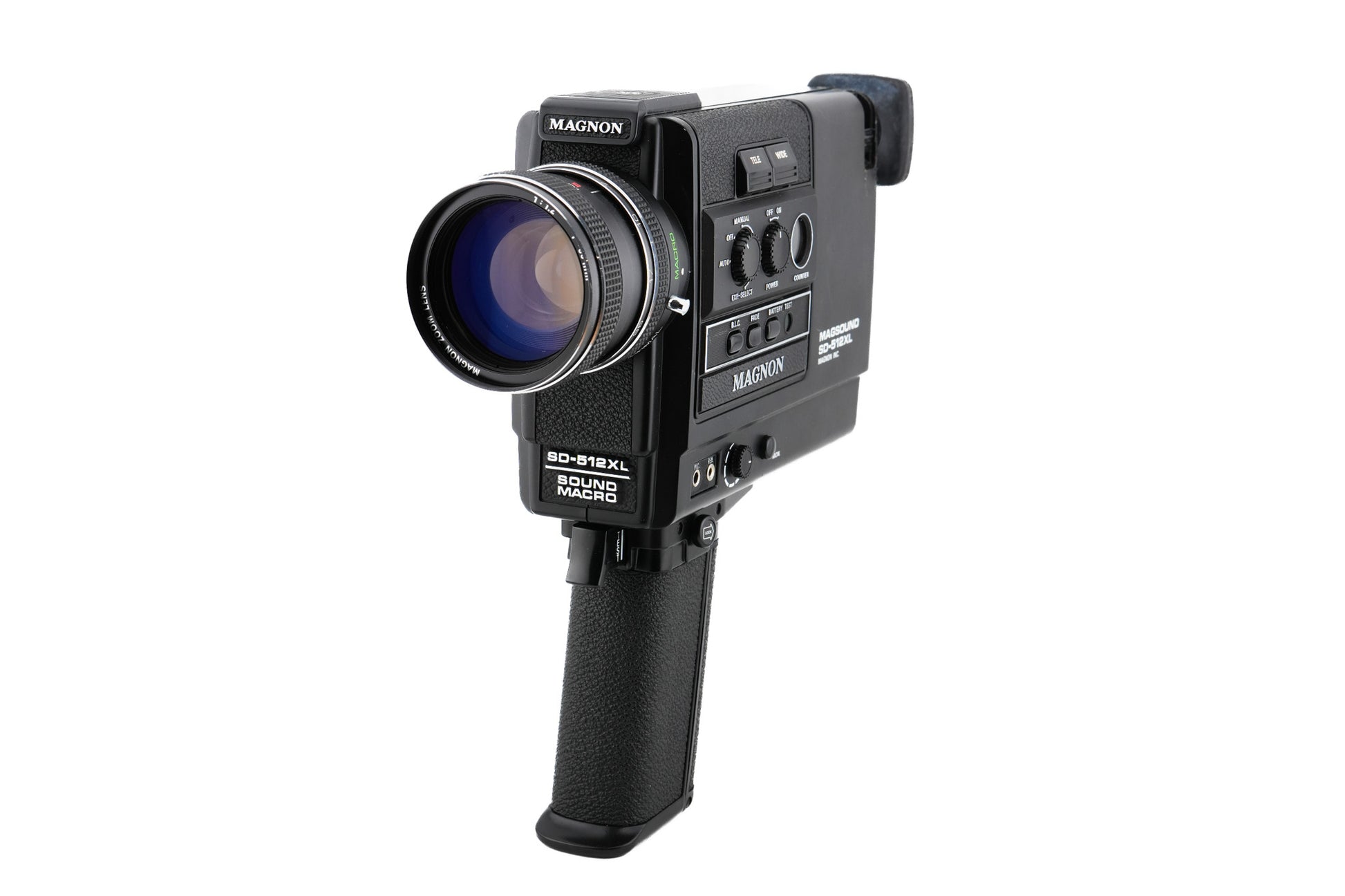 Manual focus handheld super 8 movie film camera made by Magnon in 1979. Plastic construction available in black.
