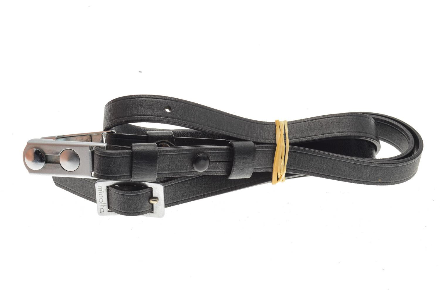 Thin (~10mm) leatherette neck strap for Minolta Autocord TLRs, with proprietary attaching peg. Has Minolta branding on size adjustment bracket.