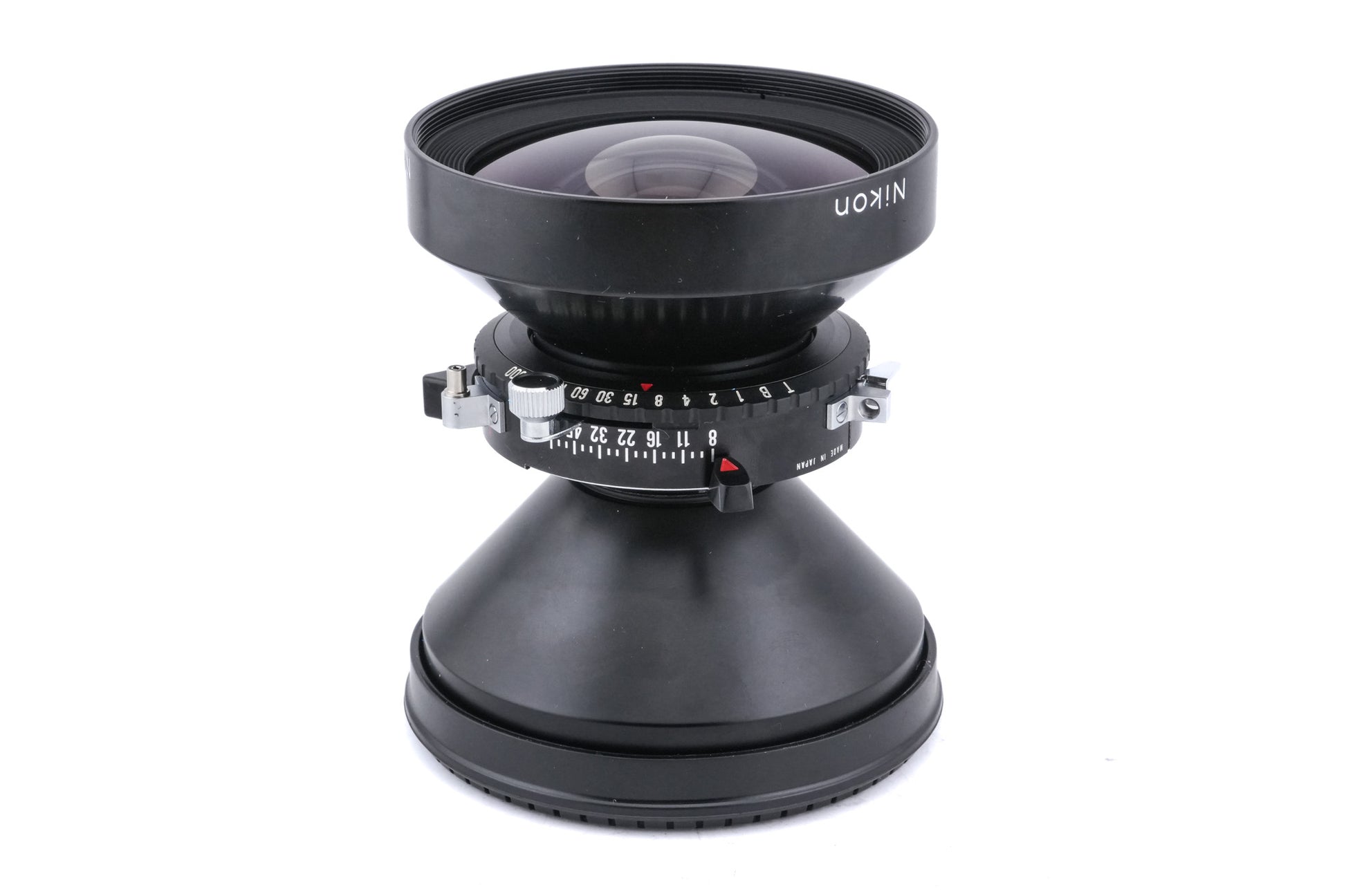 Wide angle lens made for large format systems by Nikon. It gives the equivalent field of view to a 40mm/20mm lens on full frame/35mm (when mounted to 4x5/8x10, respectively). It covers 8x10 only when using f22. Metal body available in black.