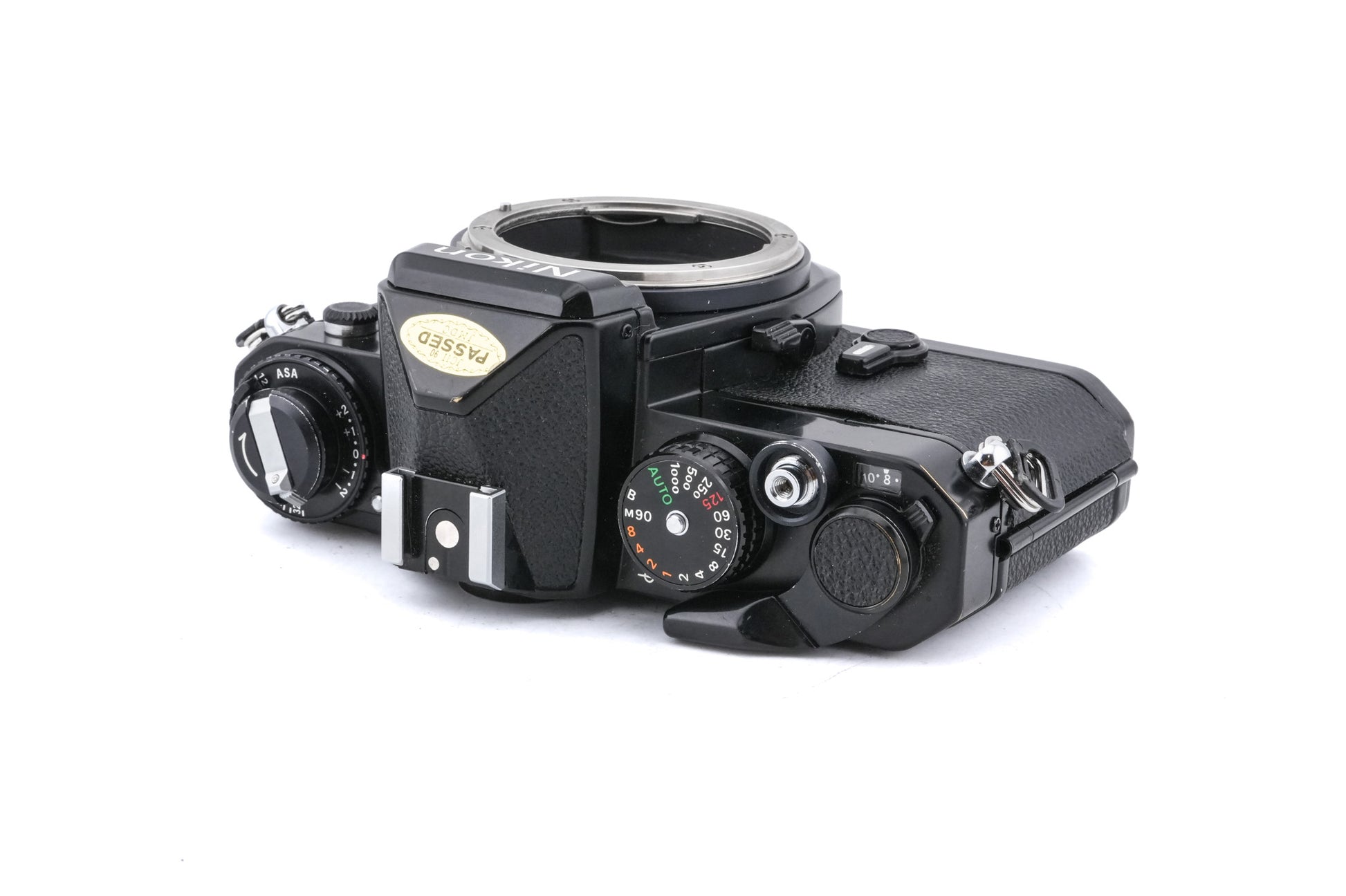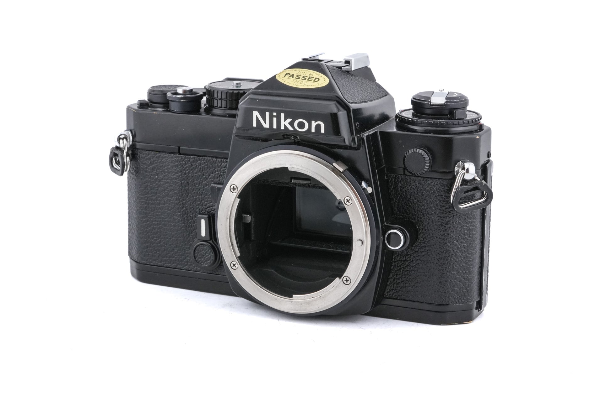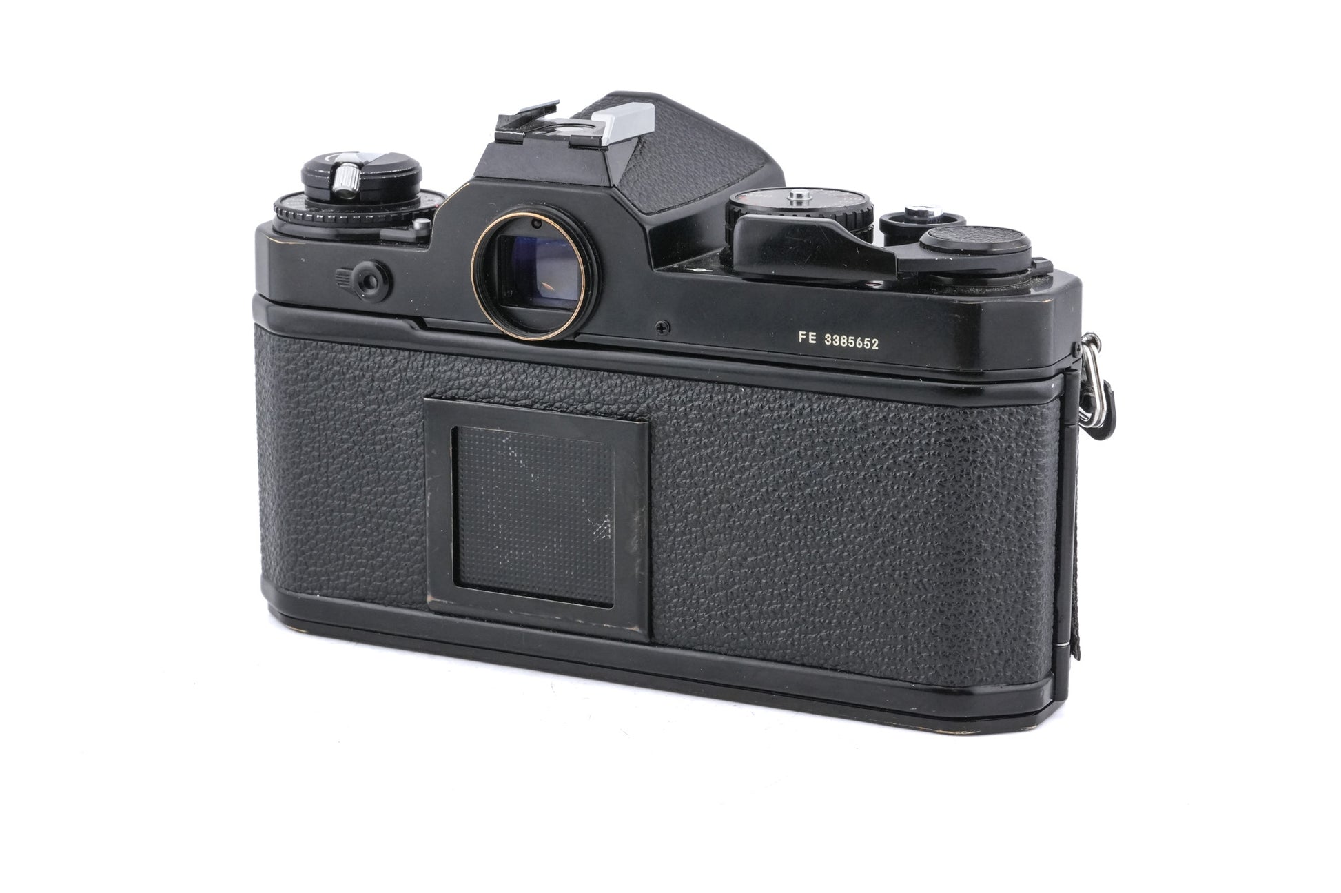 Manual focus F-mount 35mm SLR released by Nikon in 1978. It was a replacement for the Nikon EL2 and EL-W. The FE has an electronically-controlled focal plane shutter and is capable of aperture priority auto exposure as well as manual exposure. It will only meter properly with lenses that have the AI ridge and an aperture ring. Metal body available in black & silver.