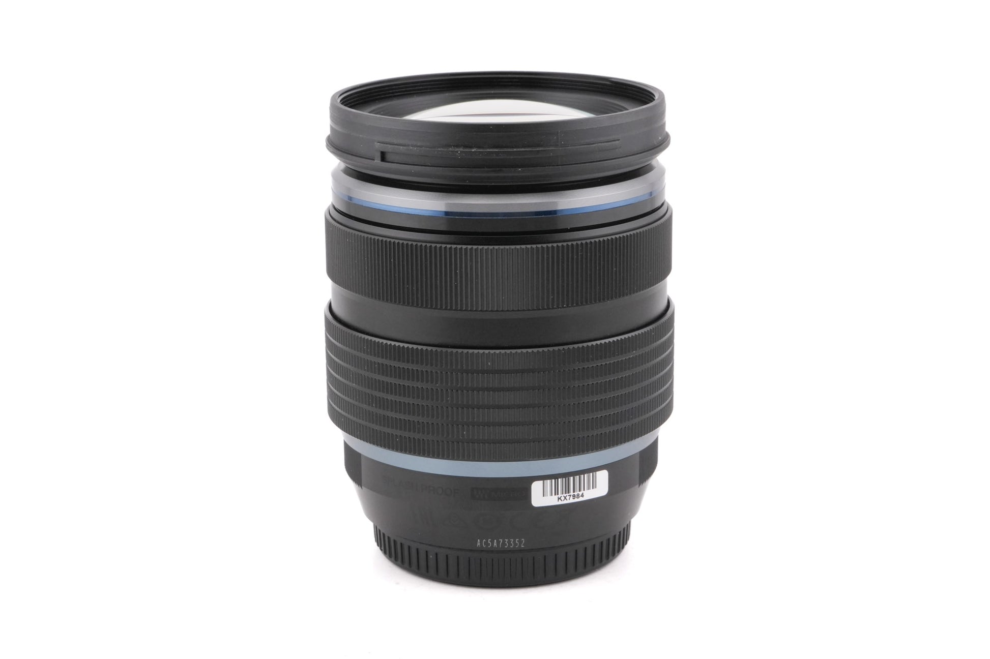 Autofocus zoom lens made for Micro Four Thirds mount mirrorless digital cameras by Olympus. The lens is designed for Micro Four Thirds-sized sensors and gives the equivalent field of view to a 24-80mm lens on full frame/35mm. It has IEC Standard publication 60529 IPX1 splash protection (when paired with a splashproof body) as well as dust protection. Metal body available in black.