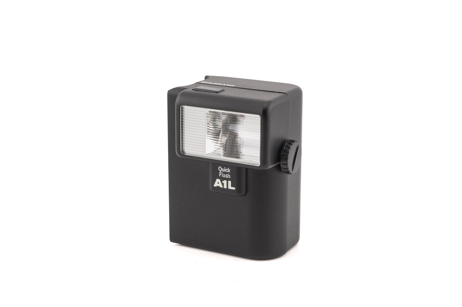 External flash made by Olympus for the XA point-and-shoot cameras. This is a low-power unit flash for close-up work. It has a built-in battery. Plastic body available in black.