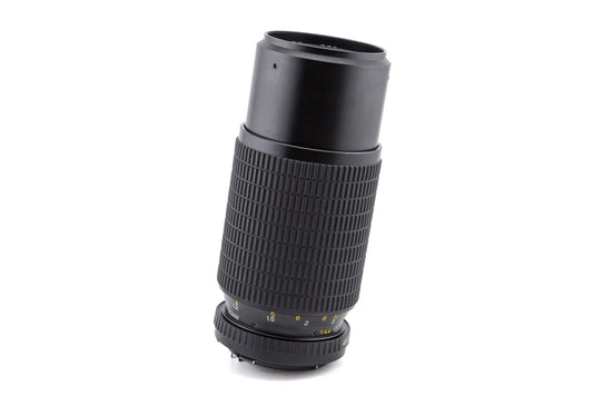 Manual focus telephoto push/pull zoom lens made for Mamiya Z-mount SLR cameras by Osawa. Metal body available in black.