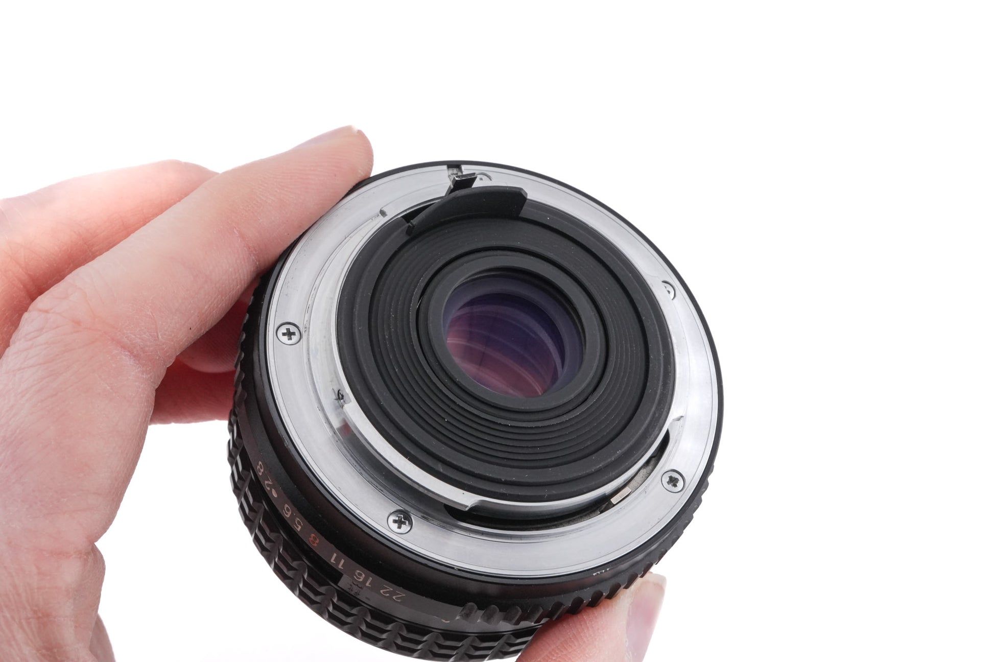 Manual focus wide normal lens made for K-mount 35mm SLR cameras by Pentax. Like other Pentax-K lenses, it was designed to work only in manual or aperture priority modes. It won't work with the advanced program modes of later cameras. Metal body available in black.