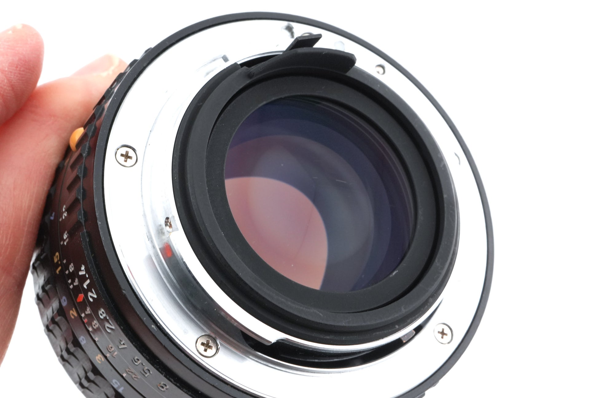 Manual focus normal lens made for K-mount SLR cameras by Pentax. It has an automatic aperture function, so it will work with shutter priority and fully programmed modes with applicable bodies. Metal / plastic body in black.