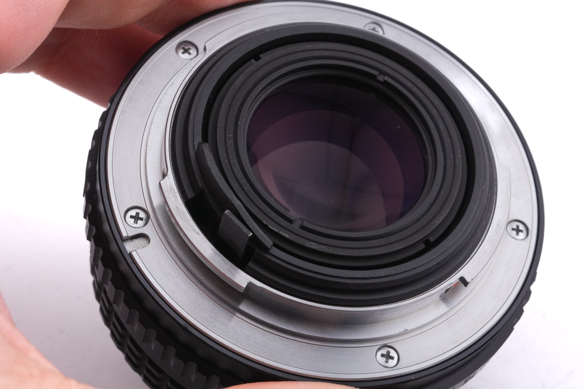 Manual focus normal lens made for K-mount 35mm SLR cameras by Pentax. It does not work with the automatic modes of later Pentax models. Plastic/metal body available in black.