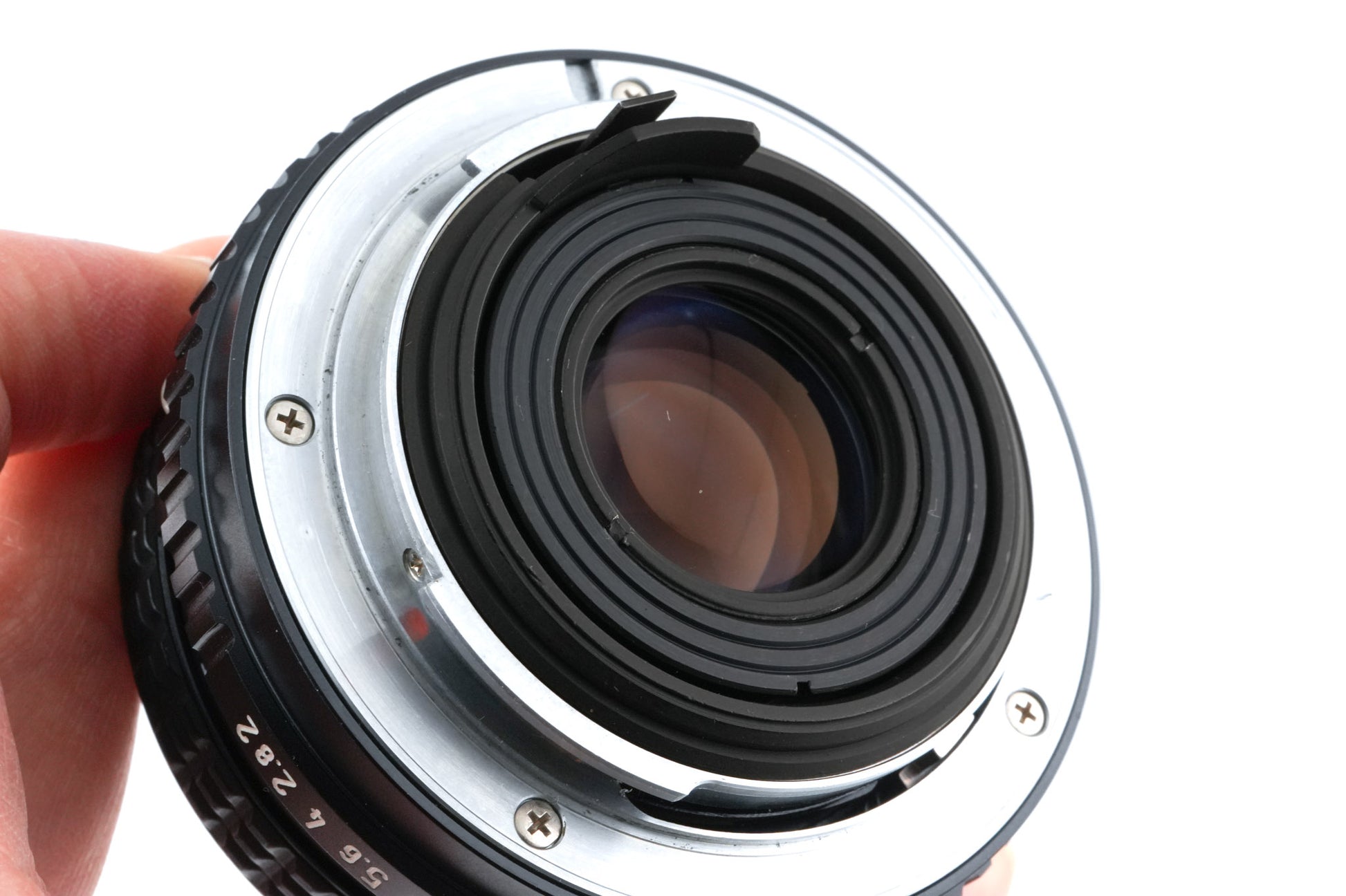 Manual focus normal lens made for K-mount 35mm SLR cameras introduced by Pentax. Early models were all-metal, but after the release of the Pentax-A line, some plastic parts were used. Metal and plastic body available in black.