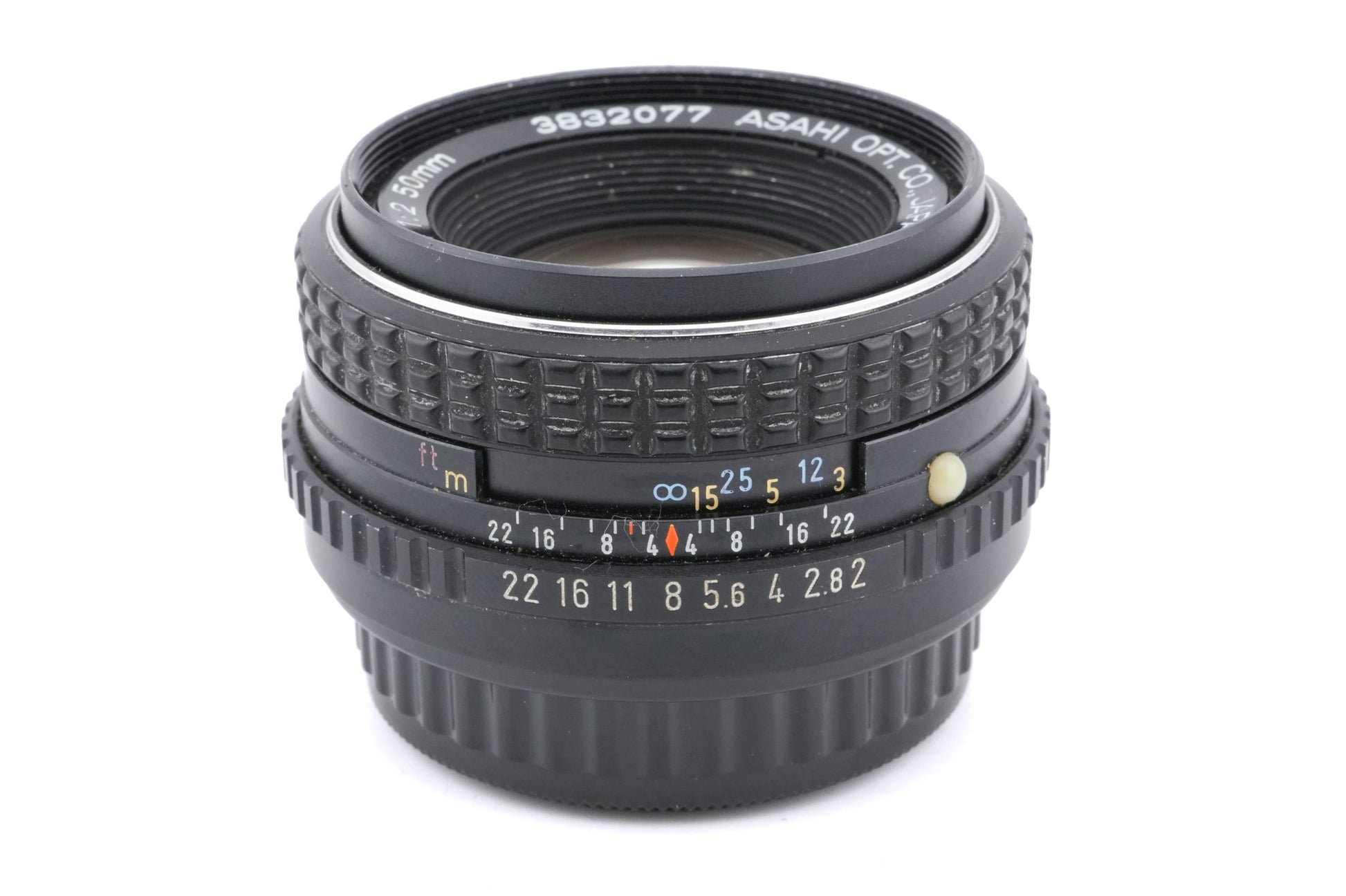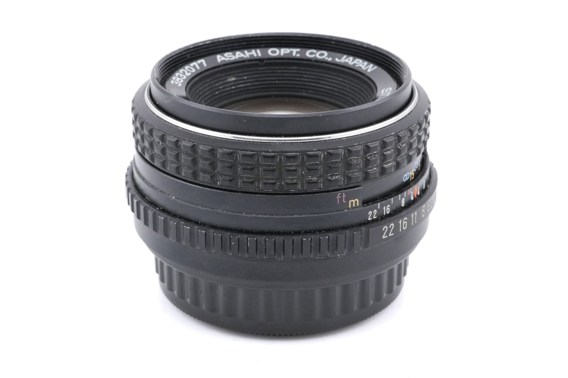 Manual focus normal lens made for K-mount 35mm SLR cameras introduced by Pentax. Early models were all-metal, but after the release of the Pentax-A line, some plastic parts were used. Metal and plastic body available in black.