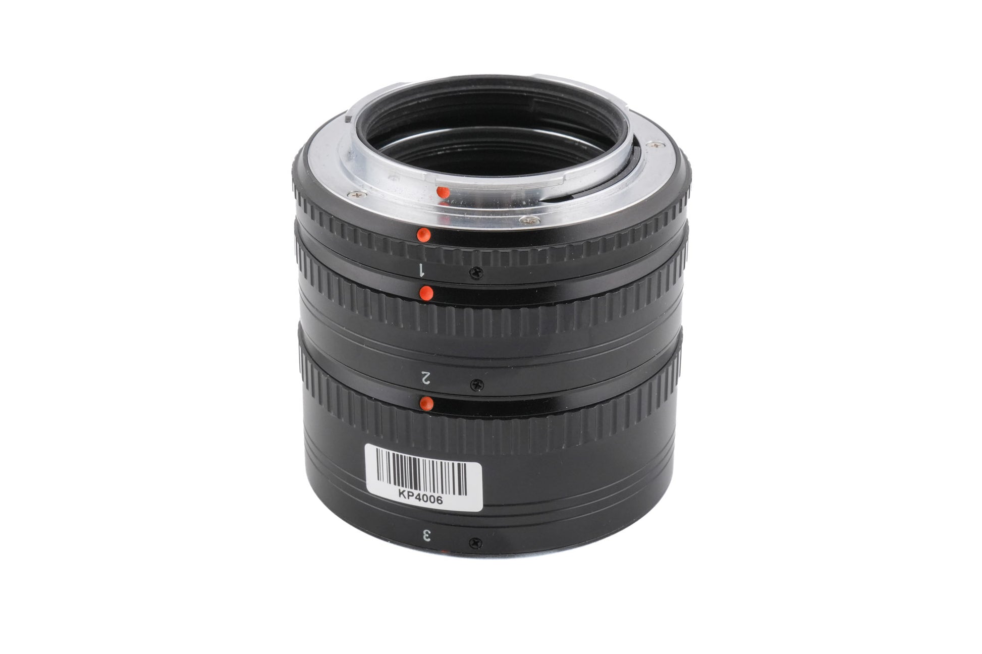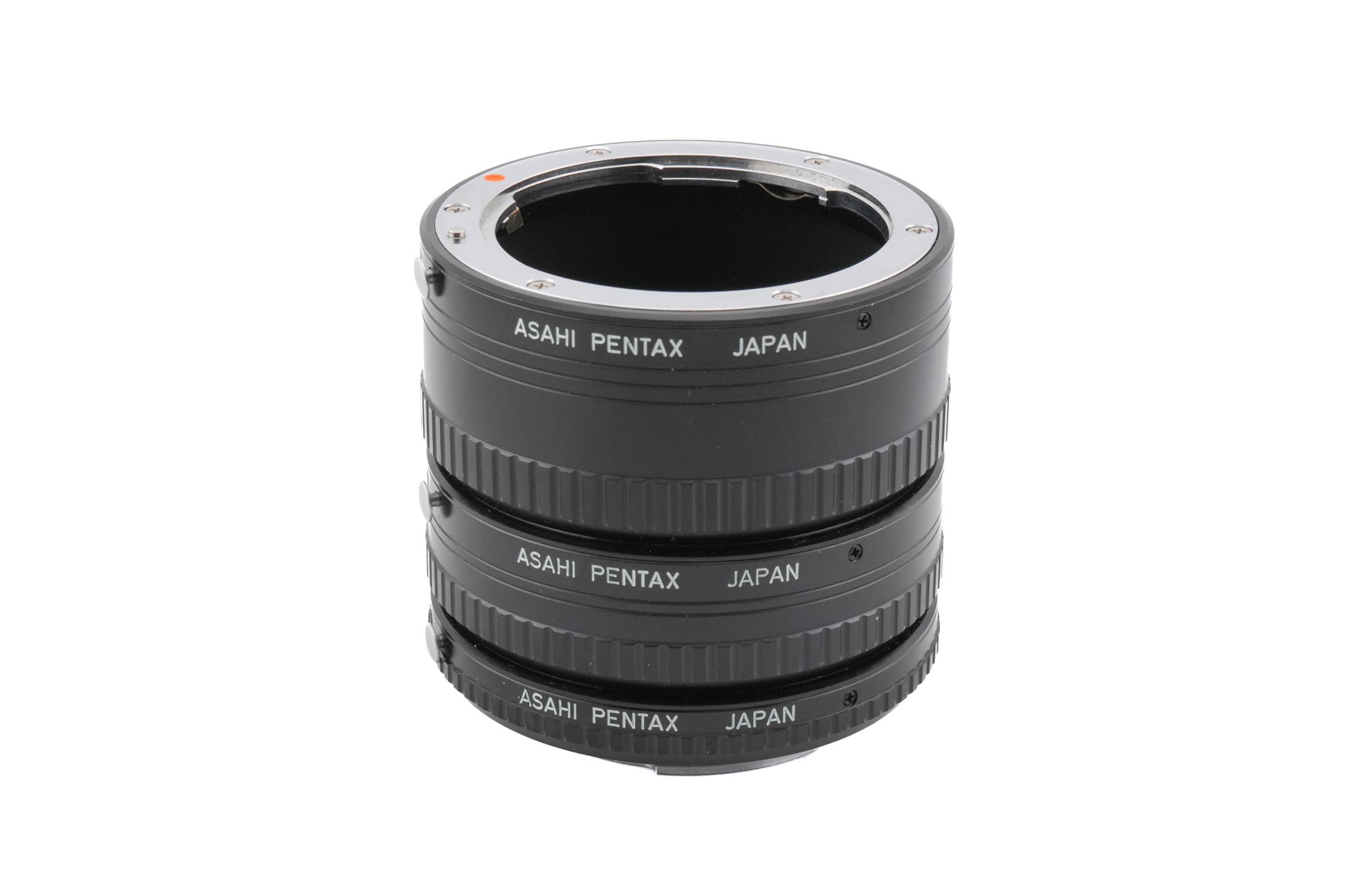 Set of 3 extension tubes made for K-mount 35mm SLR cameras by Pentax. They extend close focus capabilities with the cost of some light transmission. Metal body available in black.