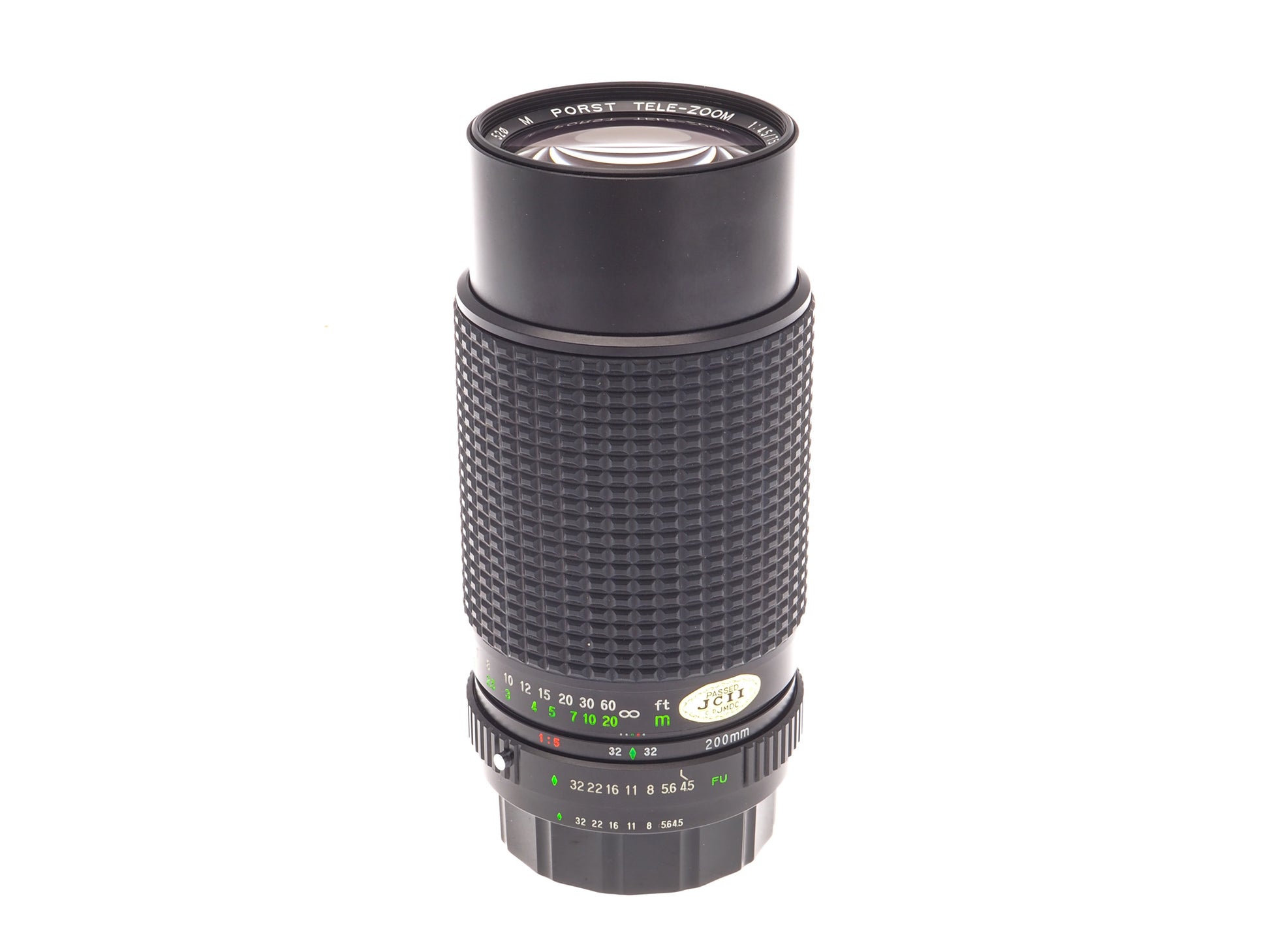 Manual focus telephoto push-pull zoom lens for Fujica X mount SLR cameras released by Porst. Has a built-in lens hood. Metal body available in black.