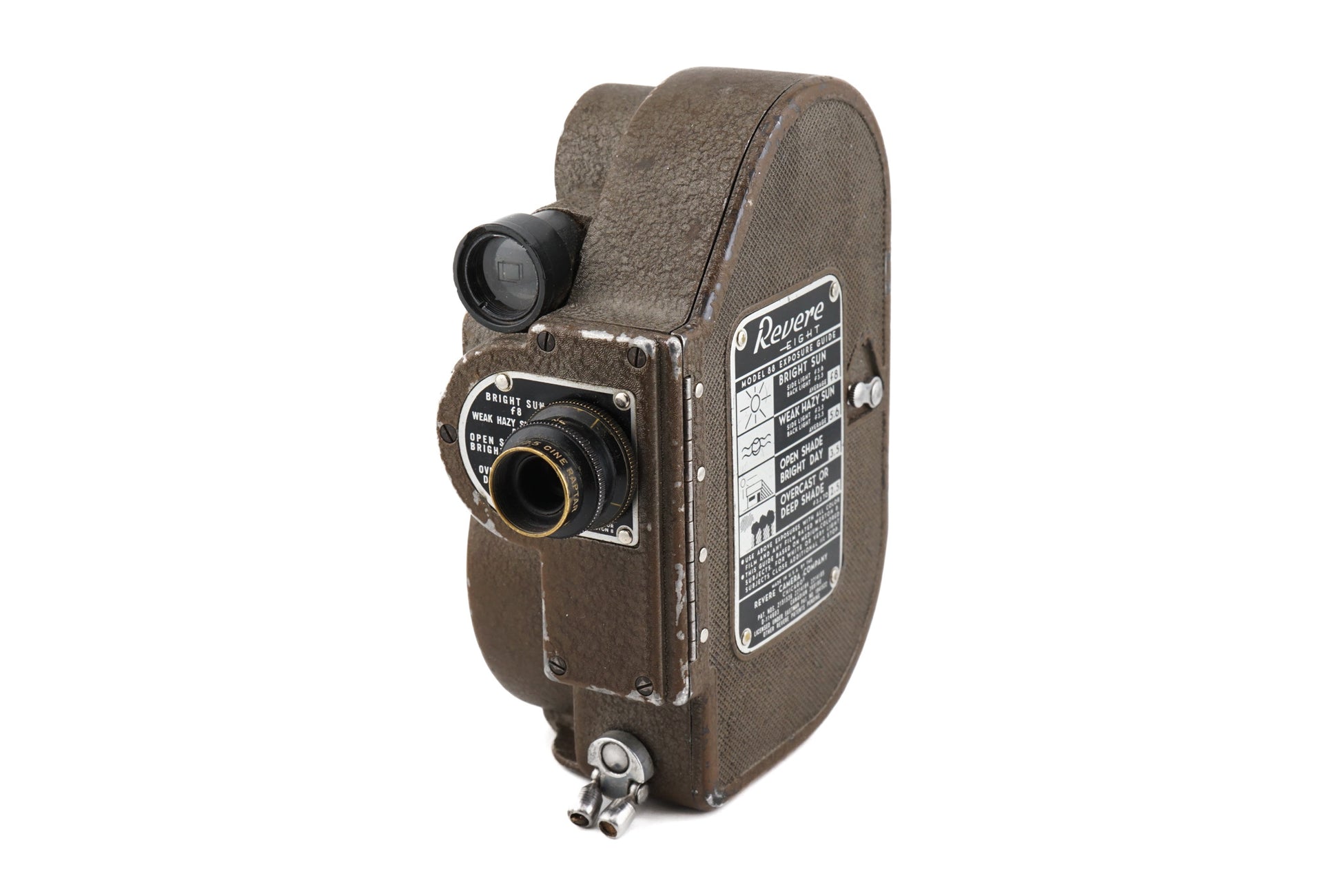 Manual focus 8mm cinema camera made by Revere between 1940-1946. Metal body available in gray/brown.