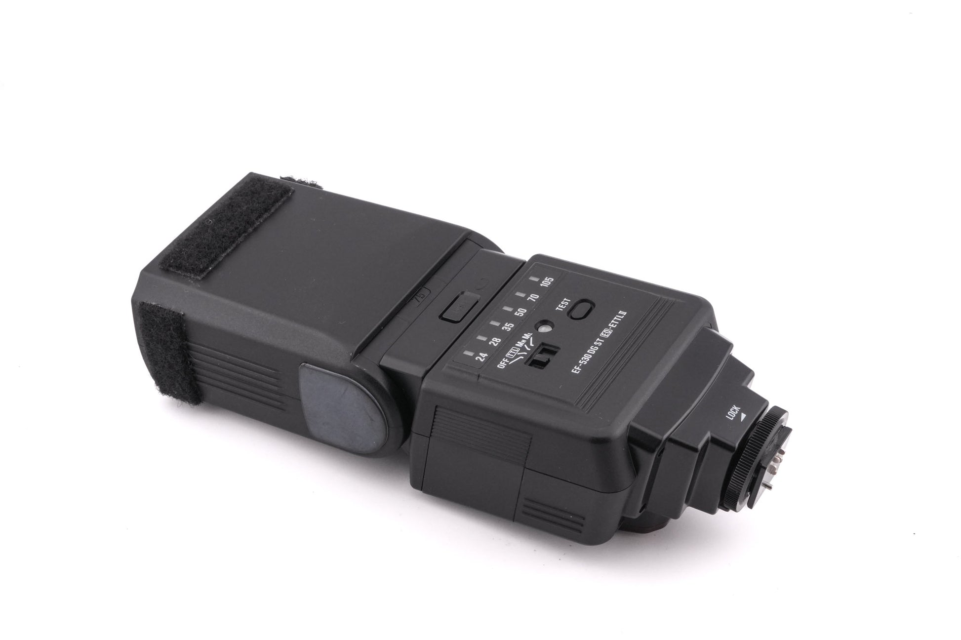 Flash made by Sigma for Canon EF SLRs. It has a built-in wide-angle adapter, tilt/shift functionality, and a slave mode. Plastic body available in black.