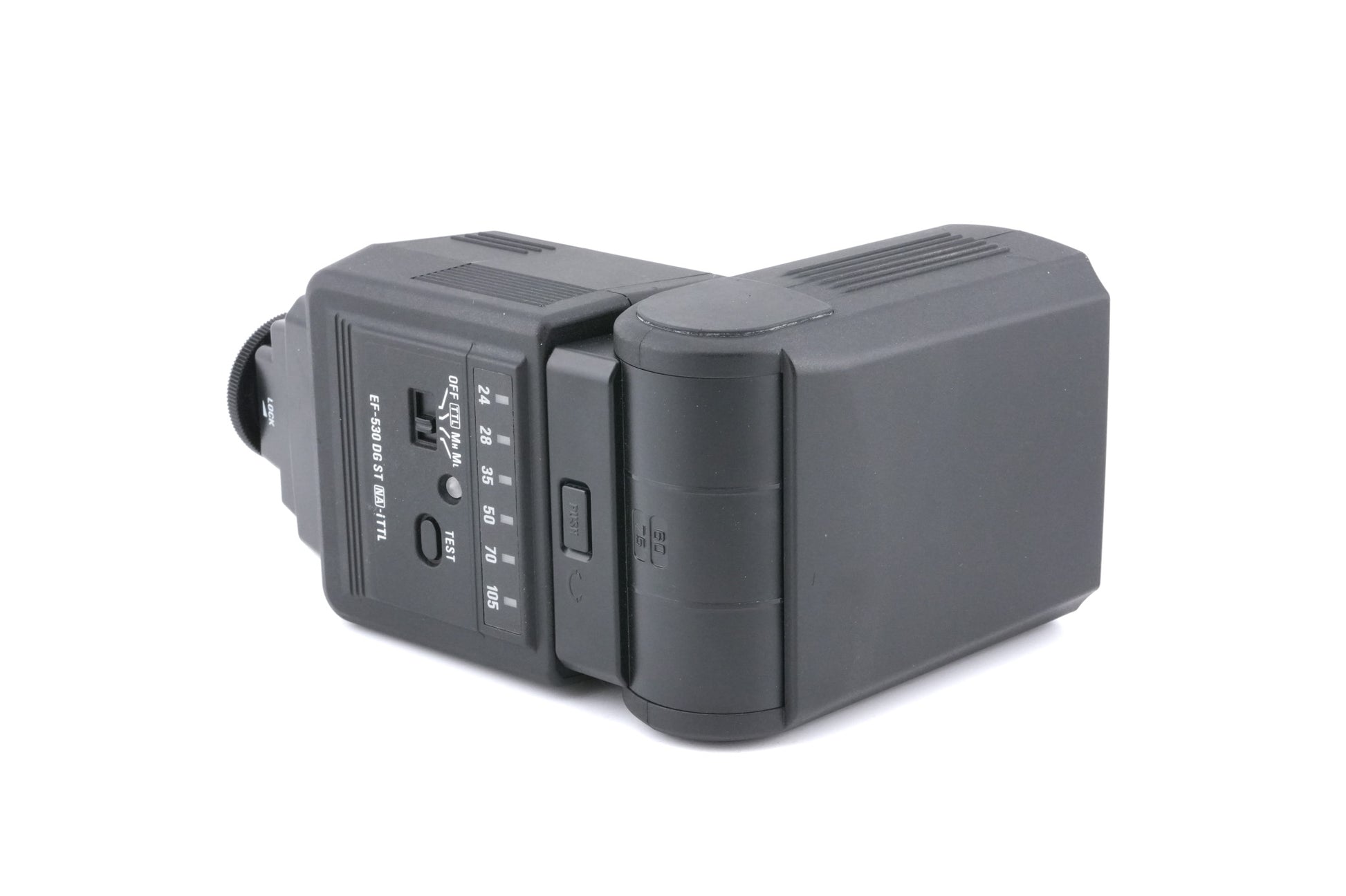 Flash made by Sigma for Canon EF SLRs. It has a built-in wide-angle adapter, tilt/shift functionality, and a slave mode. Plastic body available in black.