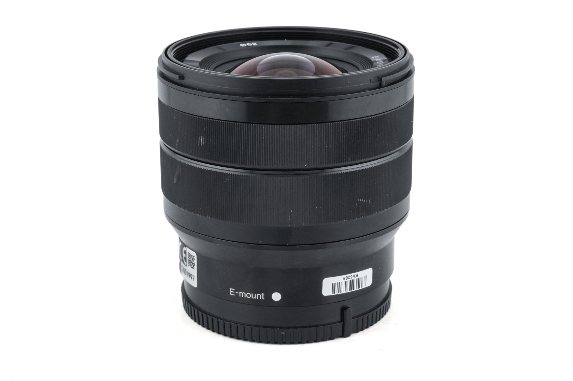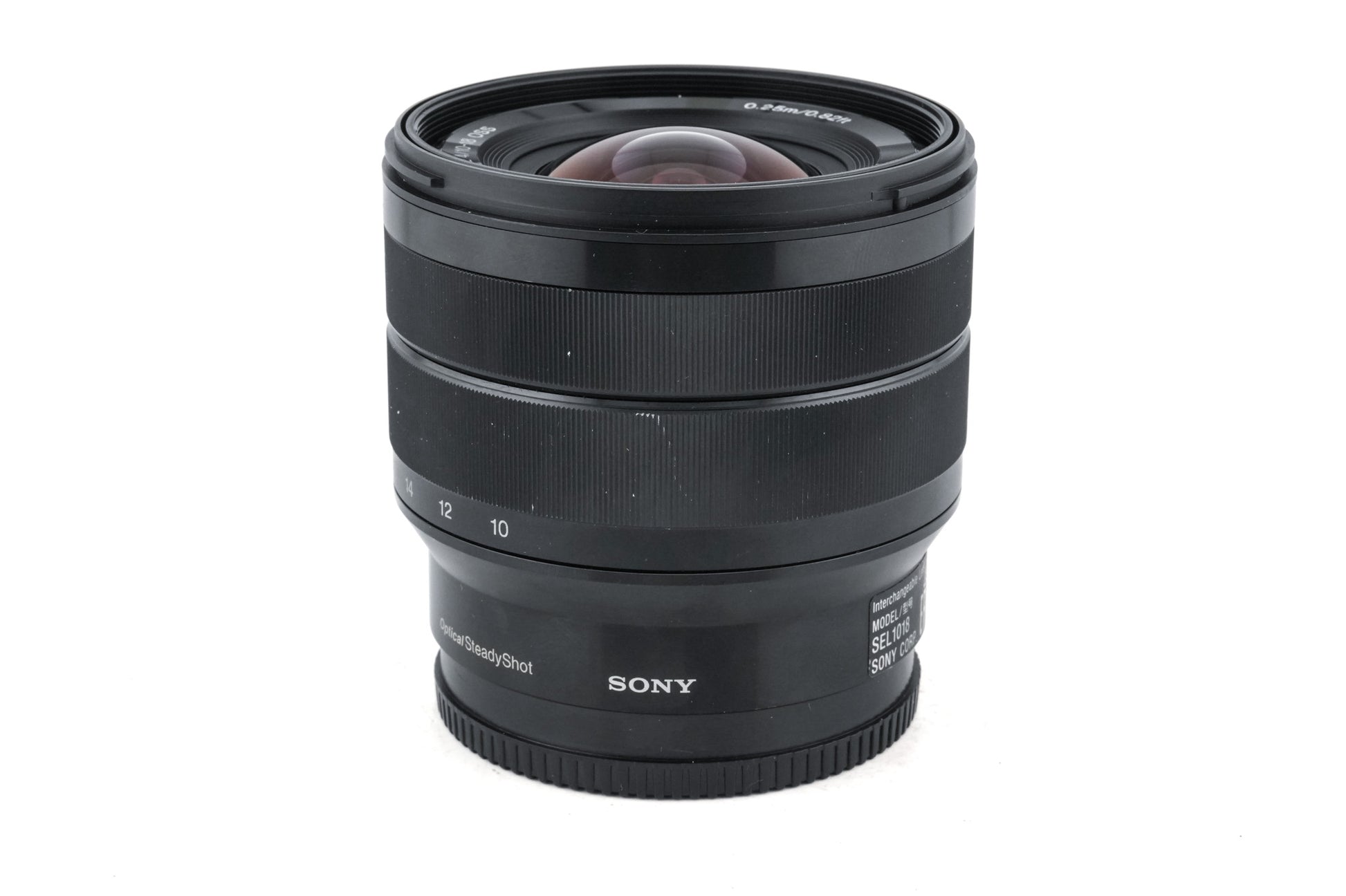 Autofocus wide-angle zoom lens made for E-mount digital mirrorless cameras by Sony. It is designed for APS-C-sized sensors and gives the equivalent field of view to a 15-27mm lens on full frame/35mm. It has an image stabilizer (OSS). The product code is SEL1018. Metal/plastic body available in black.