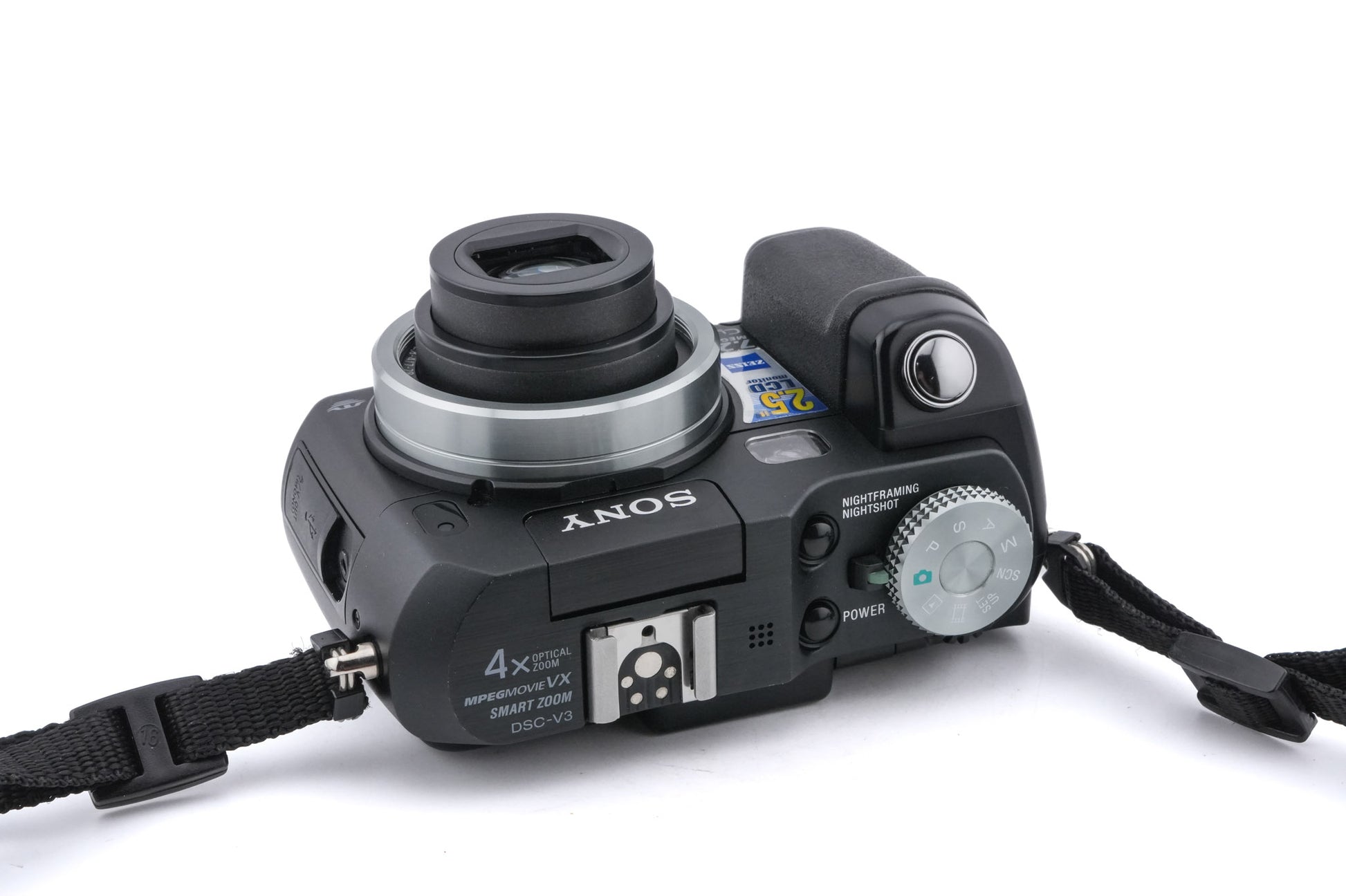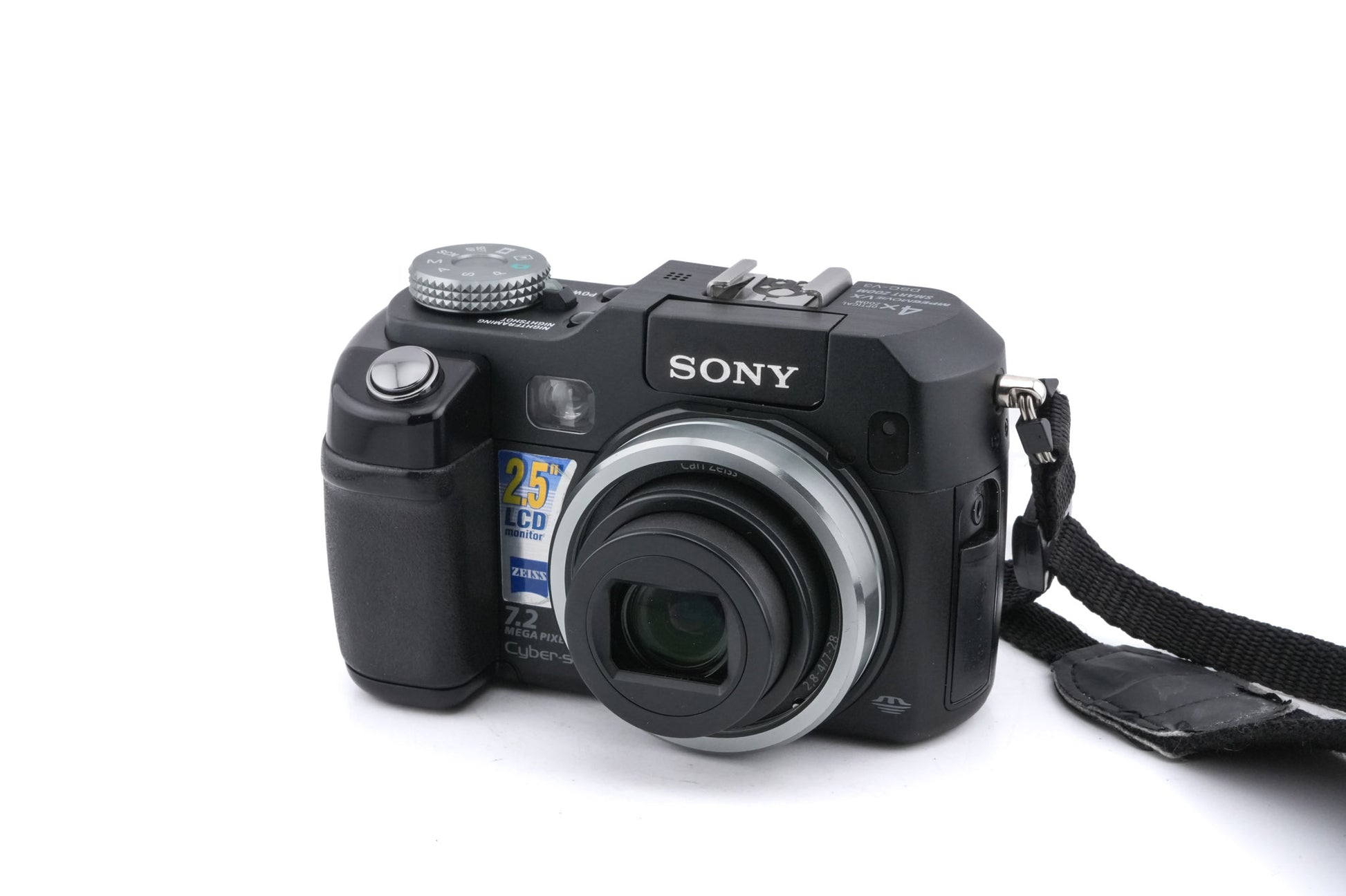 Compact digital point-and-shoot camera made by Sony introduced in 2004. Has a 34 - 136mm equivalent focal length and shoots 640 x 480 at 30fps movie clips. Has an optical viewfinder, a built-in pop-up flash, and a 2.5" TFT LCD screen. Metal and plastic body available in black.
