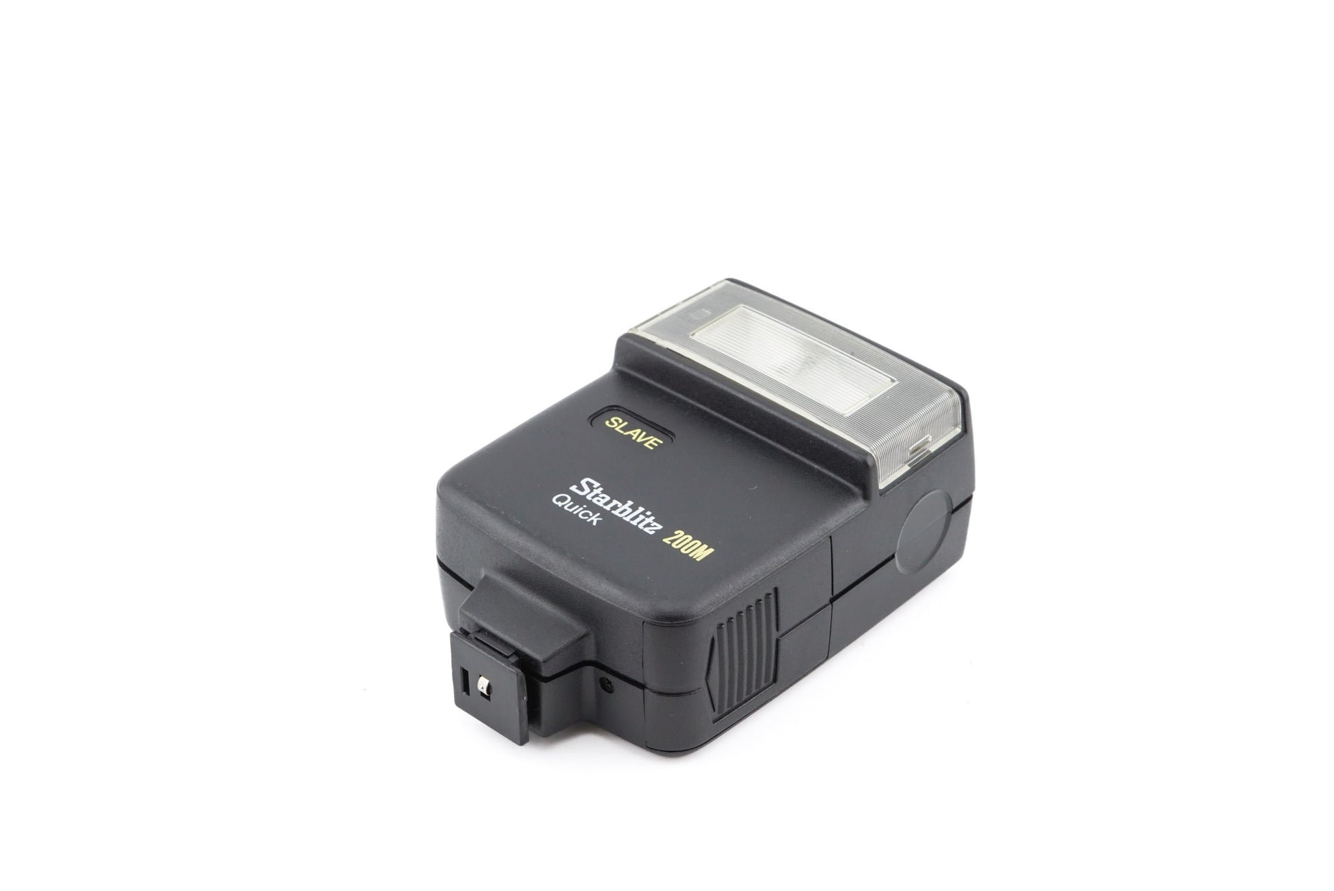 Single-pin flash with integrated flash sync cable made by Starblitz. Plastic body available in black.