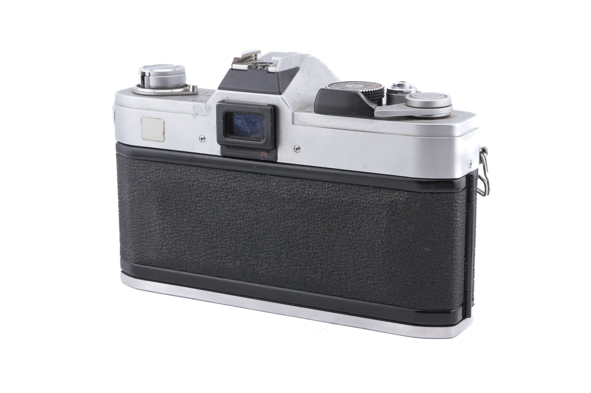 Manual focus 35mm FD-mount 35mm SLR camera released by Canon in 1971. Requires a PX625 mercury battery for the light meter, but can function without a battery as well. Has a self-timer and 1/60s flash synchronization. It uses Canon's Quick Loading (QL) system. Metal body available in black and silver.