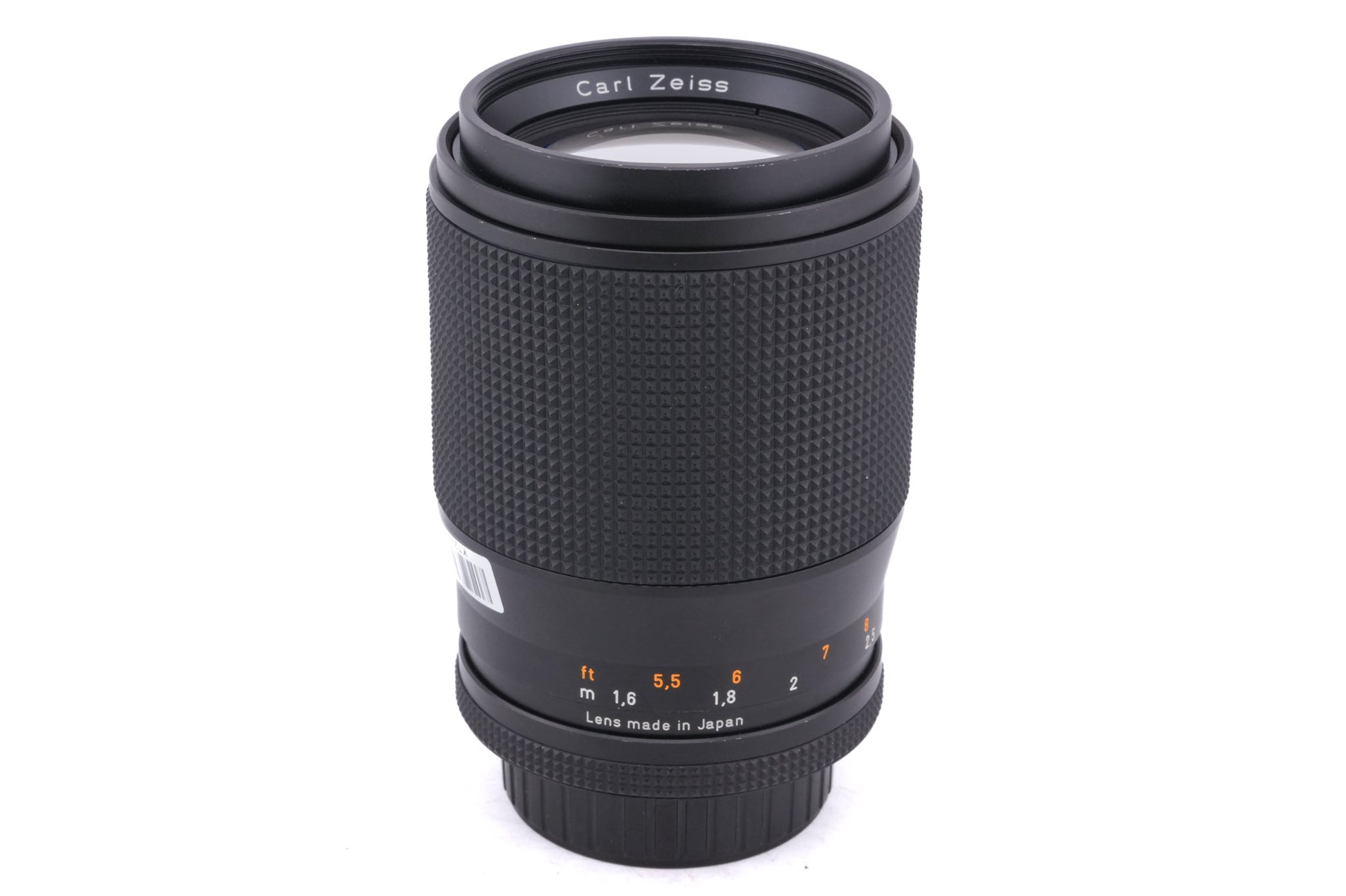 Manual focus telephoto lens made for Contax/Yashica mount 35mm SLR cameras introduced by Carl Zeiss in 1974. This lens is of the older AE variant with “ninja star” bokeh and no support for shutter priority or program modes. It has a built-in lens hood. Metal body available in black.