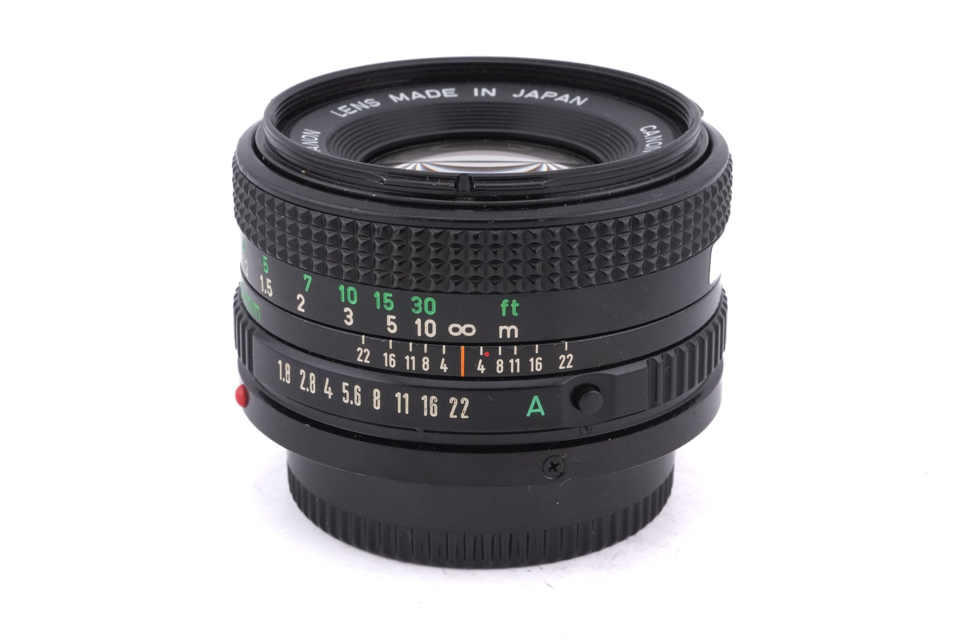 Manual focus normal lens made for FD-mount 35mm SLRs by Canon. It uses the newer style FDn bayonet mounting mechanism. Plastic and metal body available in black.
