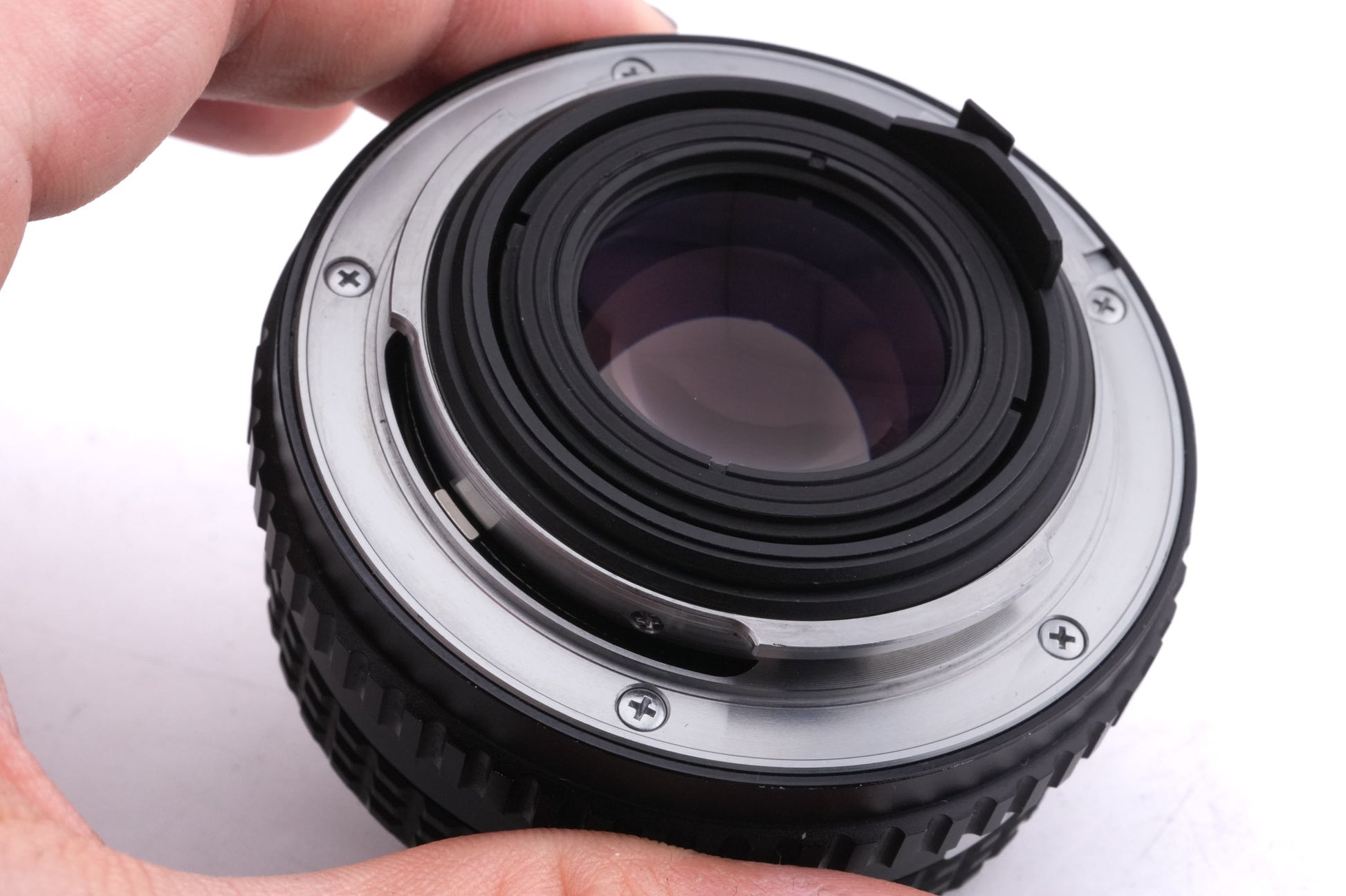 Manual focus normal lens made for K-mount 35mm SLR cameras by Pentax. It does not work with the automatic modes of later Pentax models. Plastic/metal body available in black.