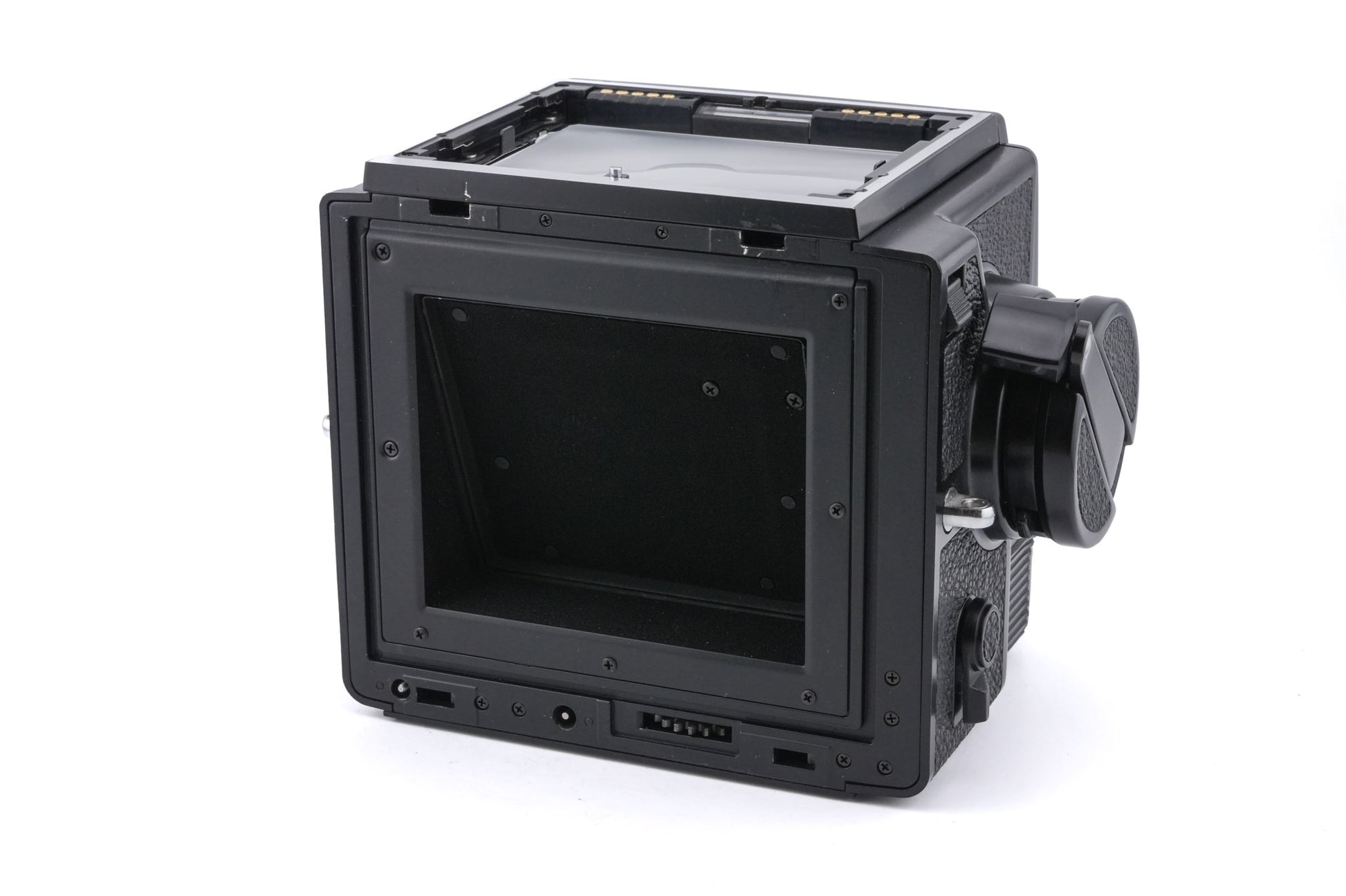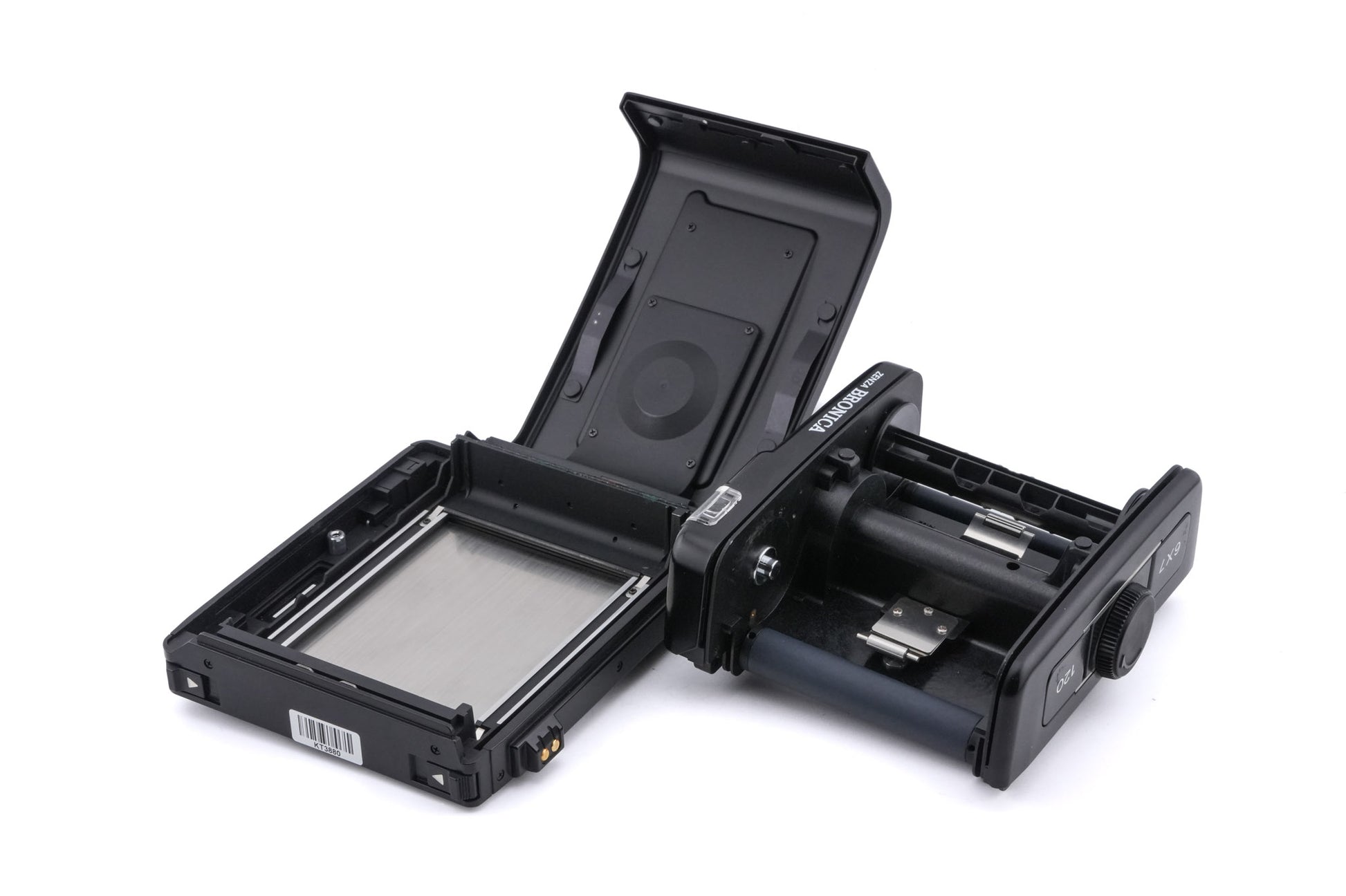 Film back made for GS mount 120 SLRs by Zenza Bronica. It takes 10 6x7cm images on each roll of 120 film. Plastic/metal body available in black.
