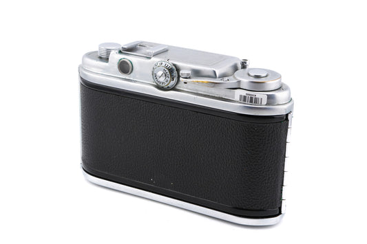 Manual focus 35mm viewfinder camera with interchangeable lenses released by AKA in 1954. Built-in framelines for 50, 75, and 90mm lenses. Metal construction available in silver.