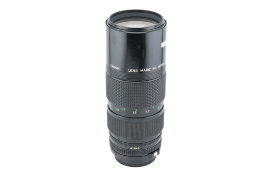 Manual focus telephoto zoom lens made for FD-mount SLRs by Canon starting in 1979. Two-touch design rather than the push/pull operation of other zoom lenses of the era. The original price (100,000 Yen) is the equivalent of around 950 Euros in 2023. Metal body available in black.