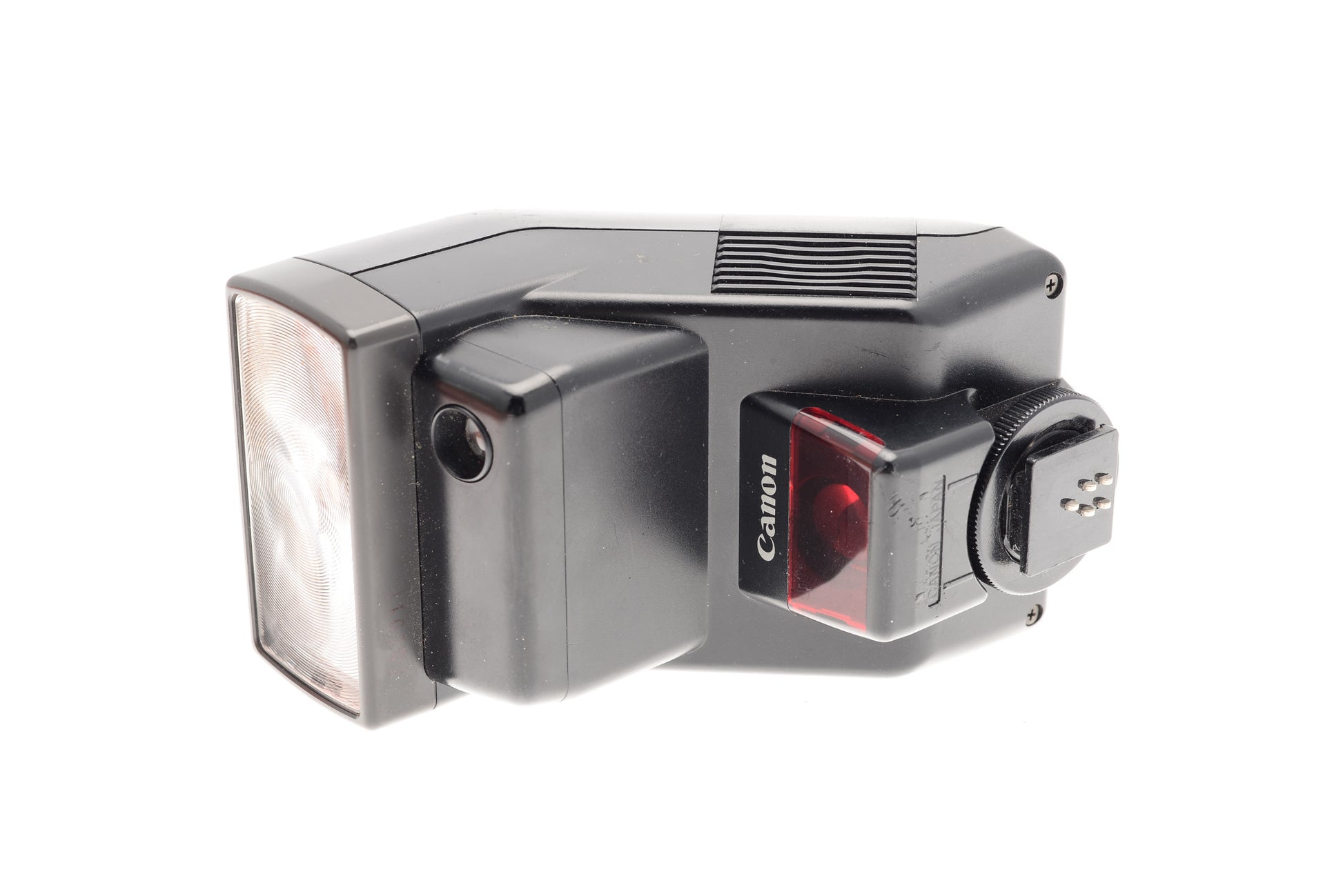 Flash made for EF-mount SLR cameras by Canon. Automatically zooms and compensates for lenses from 28mm to 70mm. Plastic body available in black.