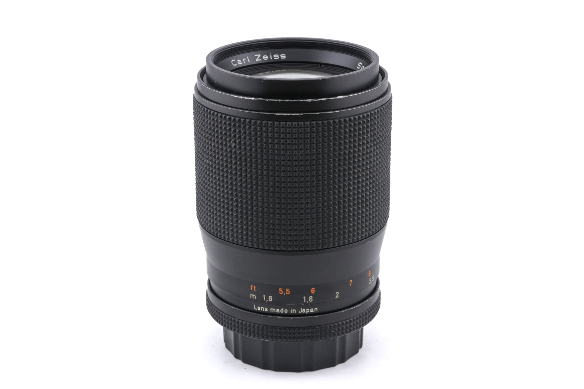 Manual focus telephoto lens made for Contax/Yashica mount 35mm SLR cameras introduced by Carl Zeiss in 1974. This lens is of the older AE variant with “ninja star” bokeh and no support for shutter priority or program modes. It has a built-in lens hood. Metal body available in black.