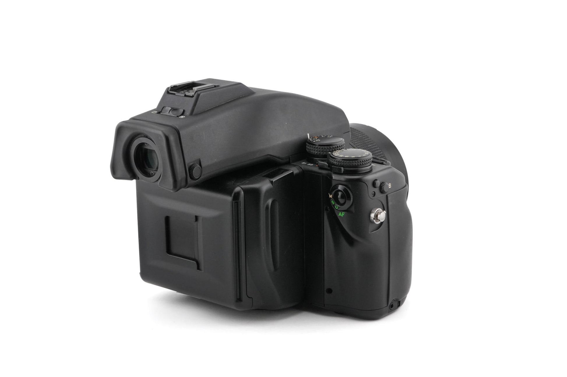 Metered eye-level prism finder made for the Contax 645 system, introduced by Contax. Metal and plastic body available in black.