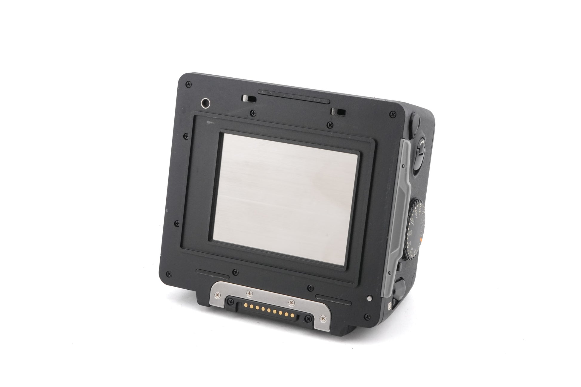120 film back made for 645 mount 120 SLRs by Contax. It works with both 120 and 220 film. Plastic/metal body available in black.