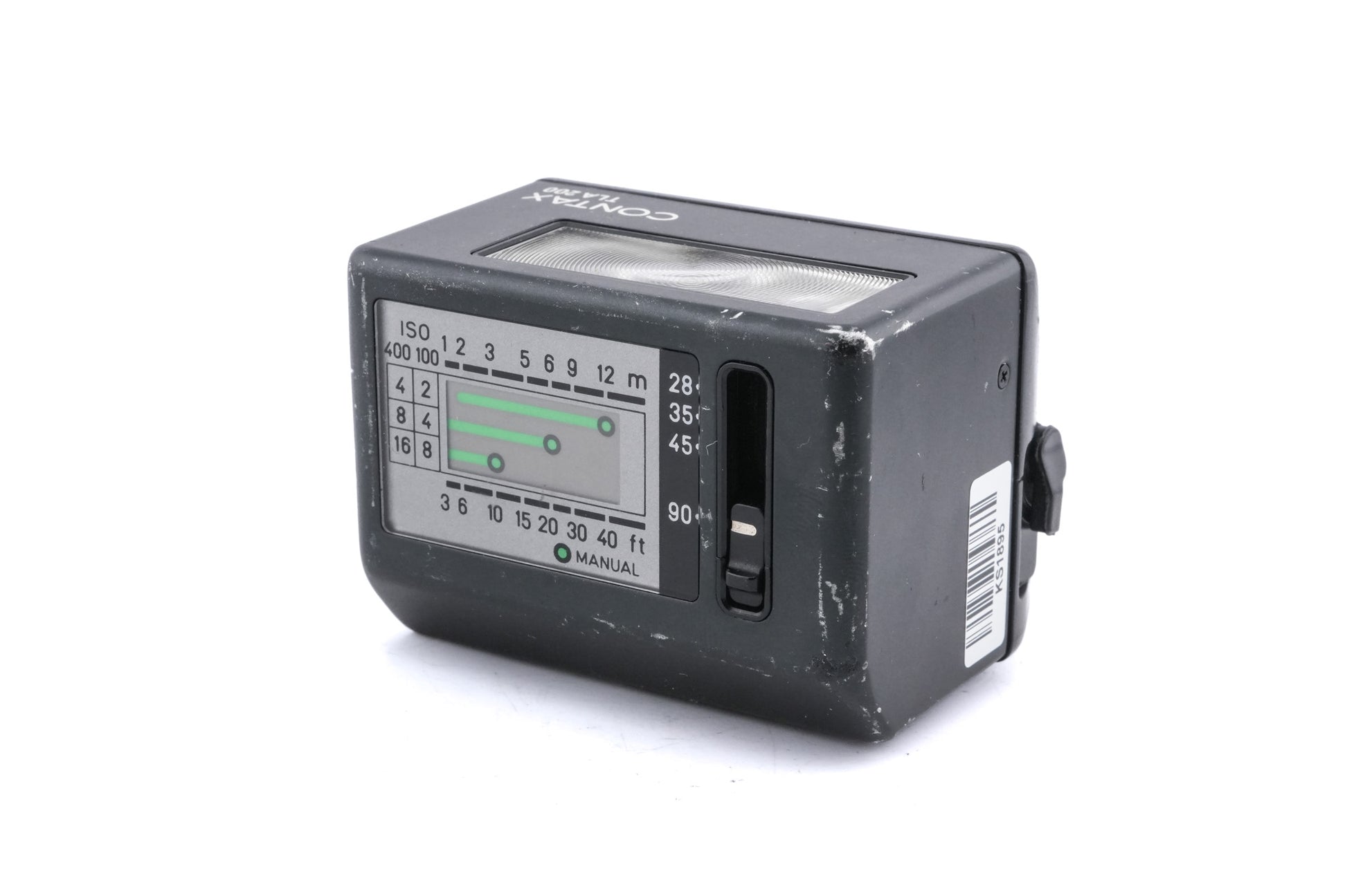 Flash made for G mount 35mm rangefinder cameras by Contax. It is a TTL flash and can zoom to cover lenses from 28-90mm. Titanium body available in black.