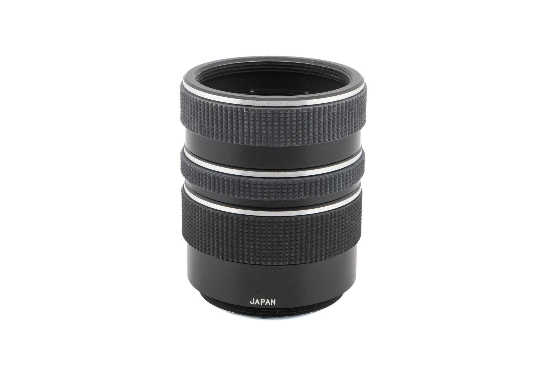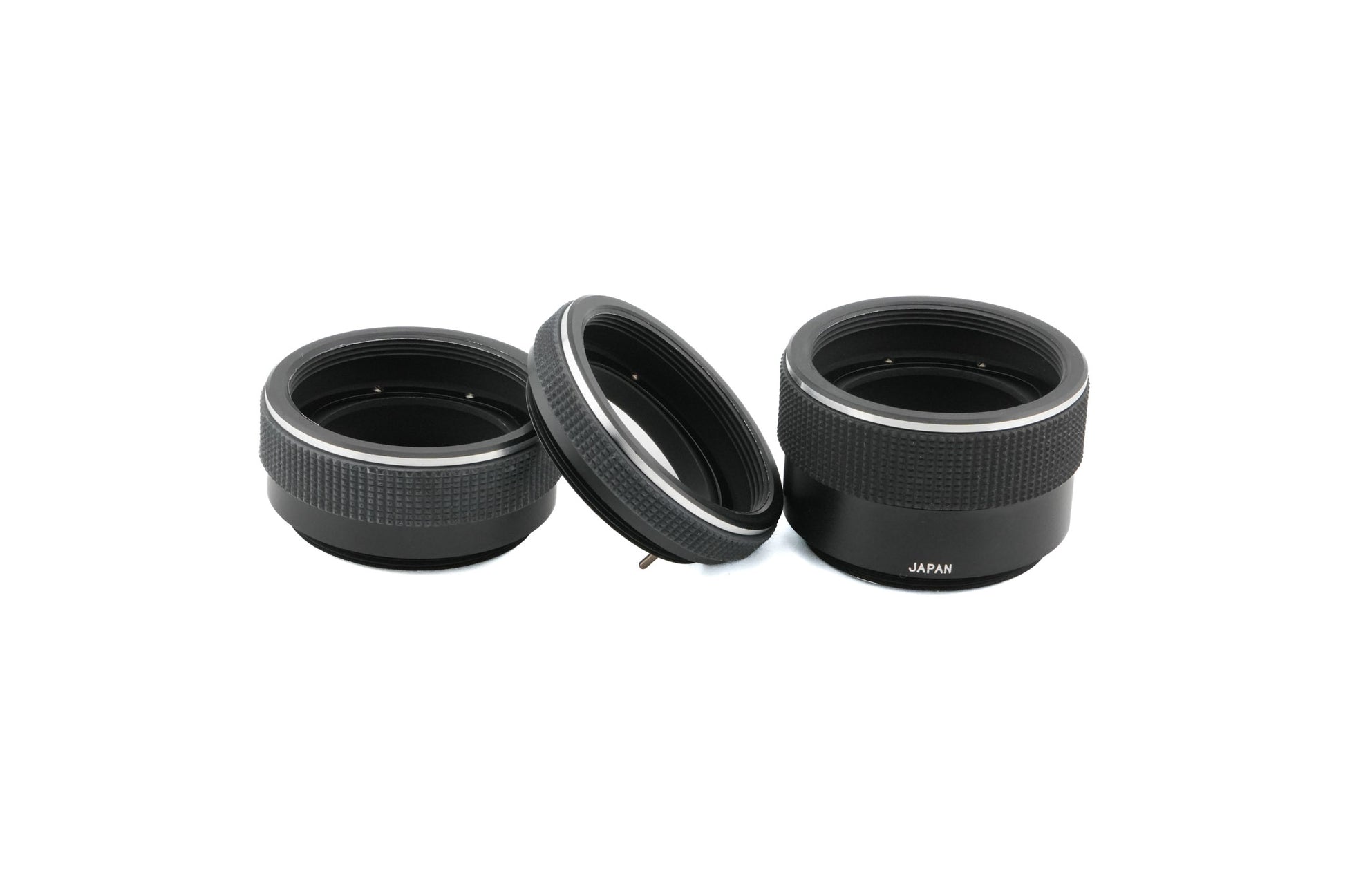 Extension tube set made for M42 screw mount SLRs. No automatic aperture control pass through, so aperture must be controlled manually. Different body styles & shapes.