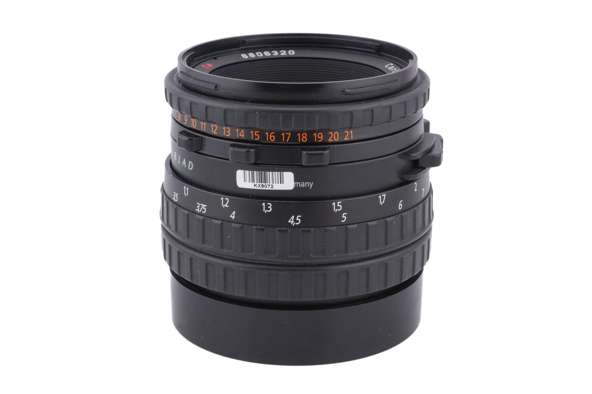 Manual focus normal lens made for the Hasselblad V system medium format cameras by Carl Zeiss for Hasselblad. The CFi is the "improved" CF series with increased contrast, upgraded shutter components, a locking PC socket for flash sync cords, a redesigned and smoother focusing mechanism, a reinforced rear bayonet plate, and a non-metallic front bayonet. The built-in Prontor shutter allows for flash synchronization up to 1/500s. It has in-between aperture stops. Plastic and metal body available in black.