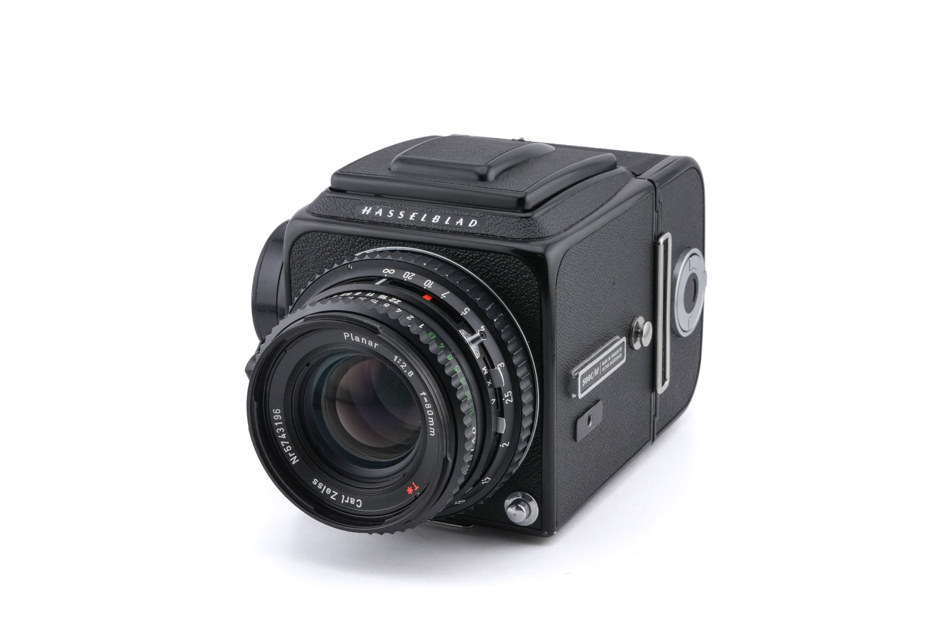 This Hasselblad 500C/M (Black, 10170) + 80mm f2.8 Planar T* C (Black, 20028) + Acute Matte Focusing Screen (42165) + Waist Level Finder (Old / Black, 42277) + A12 Film Magazine (Black, 30147) includes: